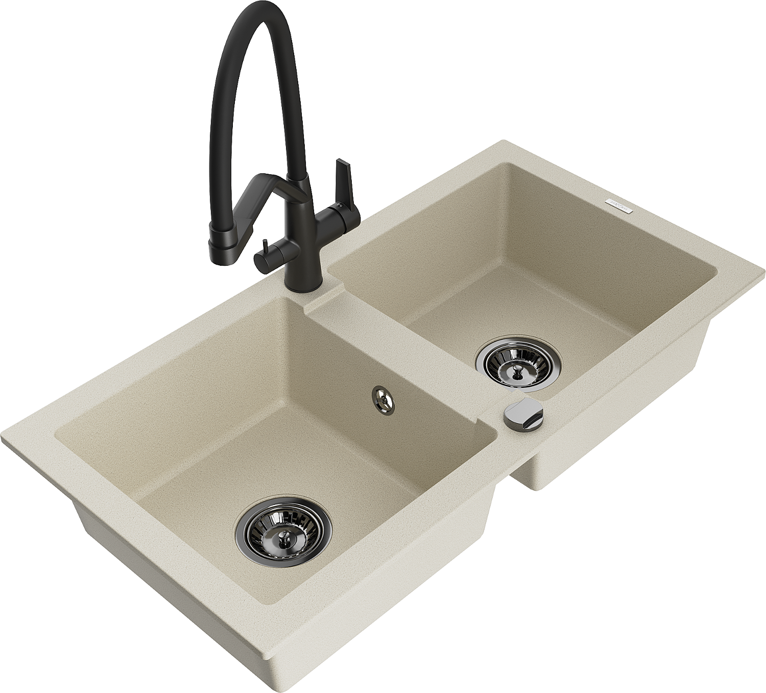 Mexen Mario 2-bowl granite kitchen sink with Duo tap, beige - 6504-69-671701-70-B