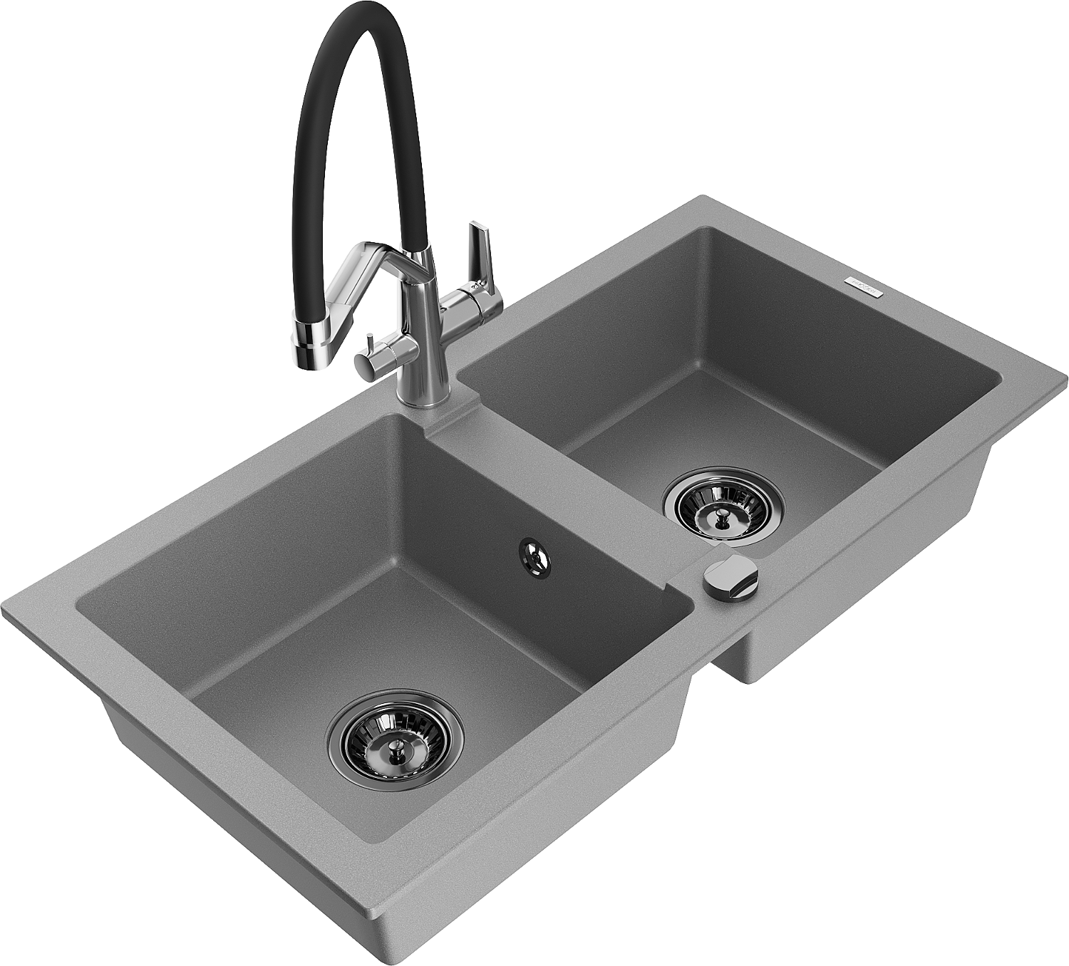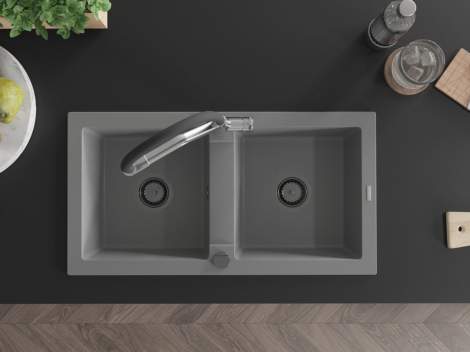 Mexen Mario 2-bowl granite kitchen sink with Duo tap, grey - 6504-71-671701-07-B
