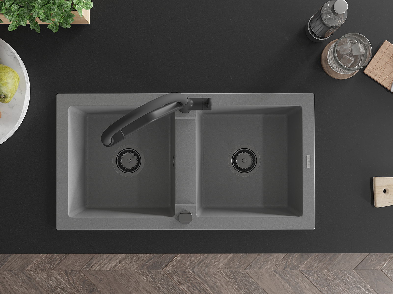 Mexen Mario granite sink 2-bowl with Duo kitchen tap, grey - 6504-71-671701-70-B