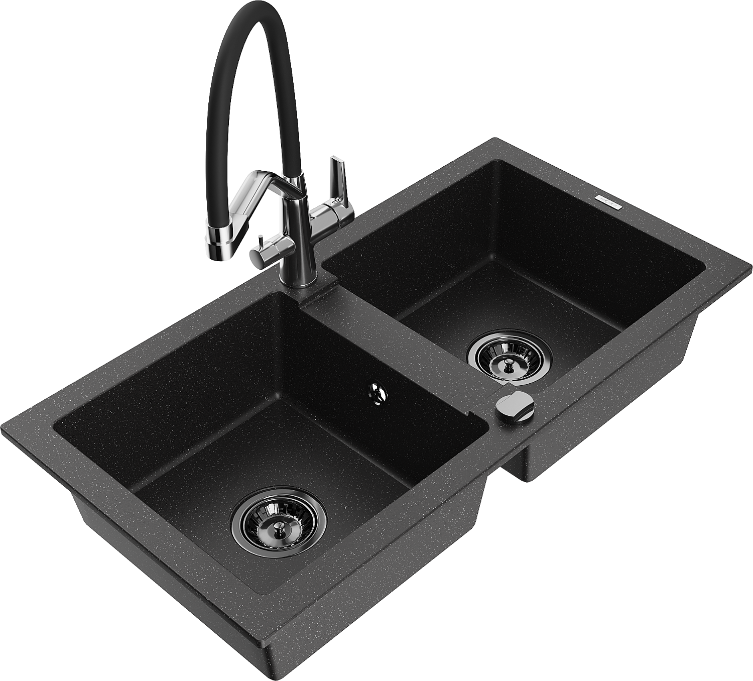 Mexen Mario granite sink 2-chamber with Duo kitchen tap, black/silver metallic - 6504-73-671701-07-B
