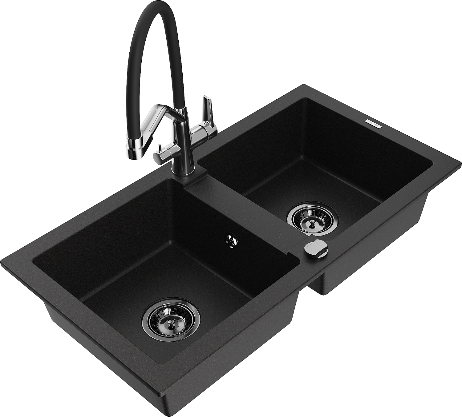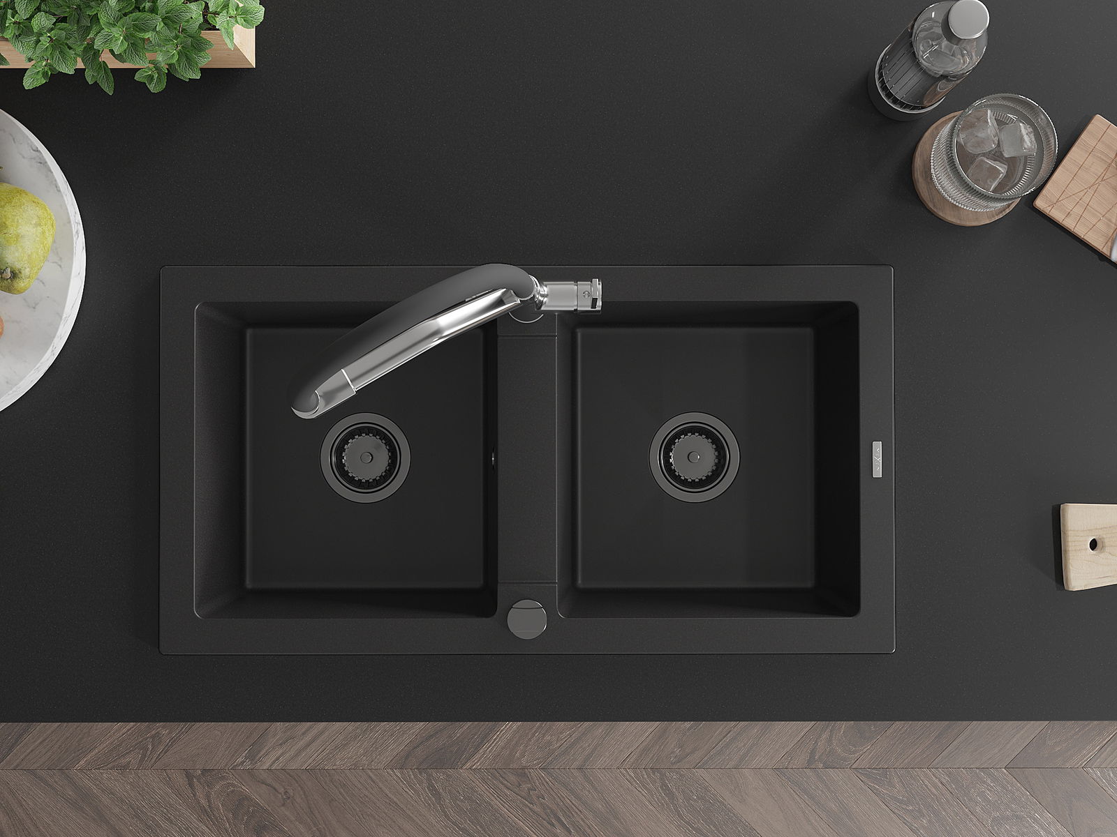 Mexen Mario granite kitchen sink, 2-bowl with Duo kitchen tap, black - 6504-77-671701-07-B