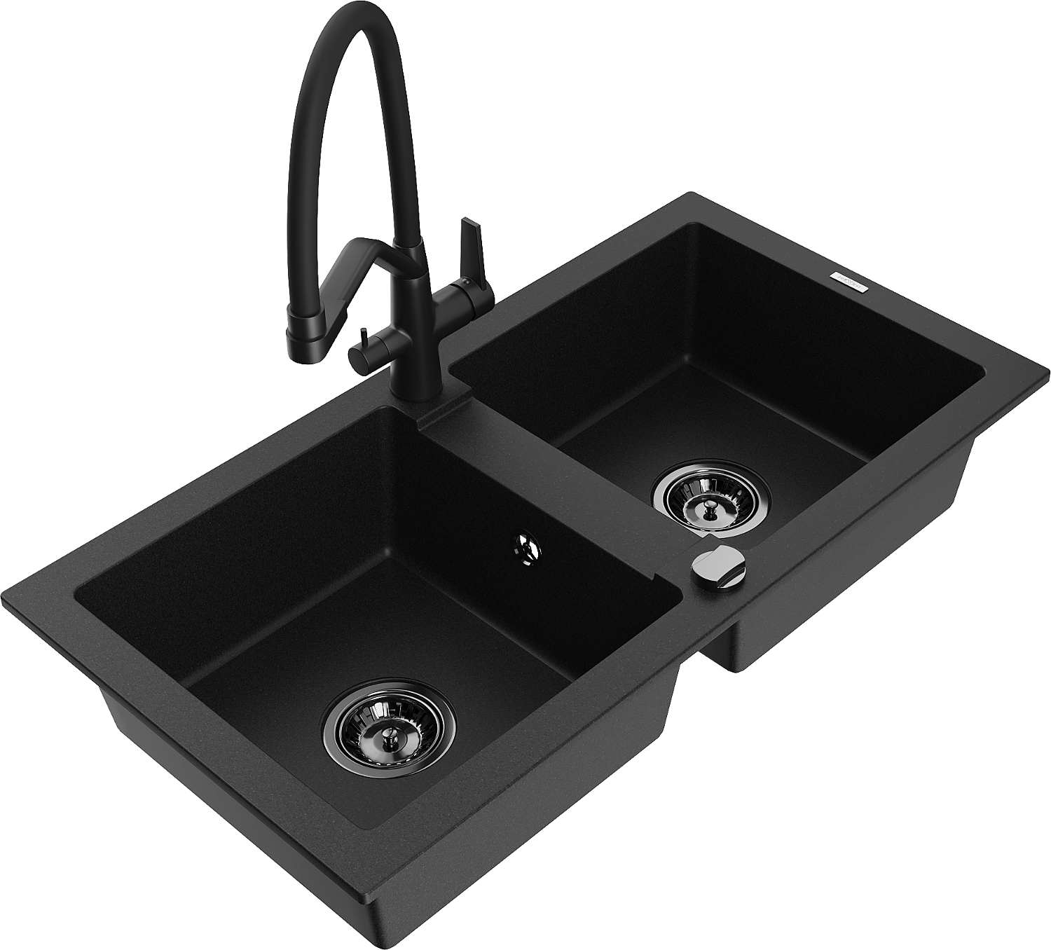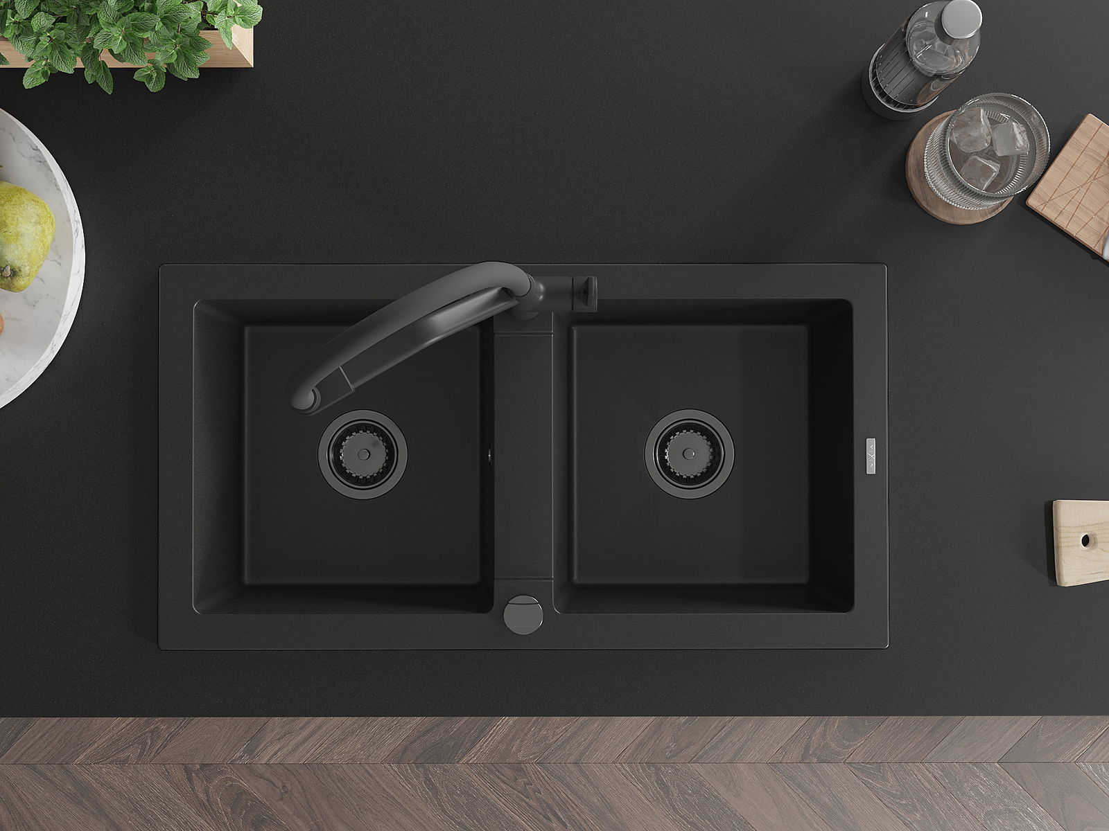 Mexen Mario granite sink 2-chamber with Duo kitchen tap, black - 6504-77-671701-70-B