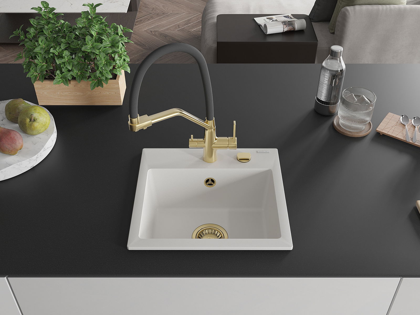 The surface of the sink is resistant to stains and discolouration, making it easy to maintain cleanliness and retain its colour for a long time of use. An aesthetic and practical addition to any kitchen.