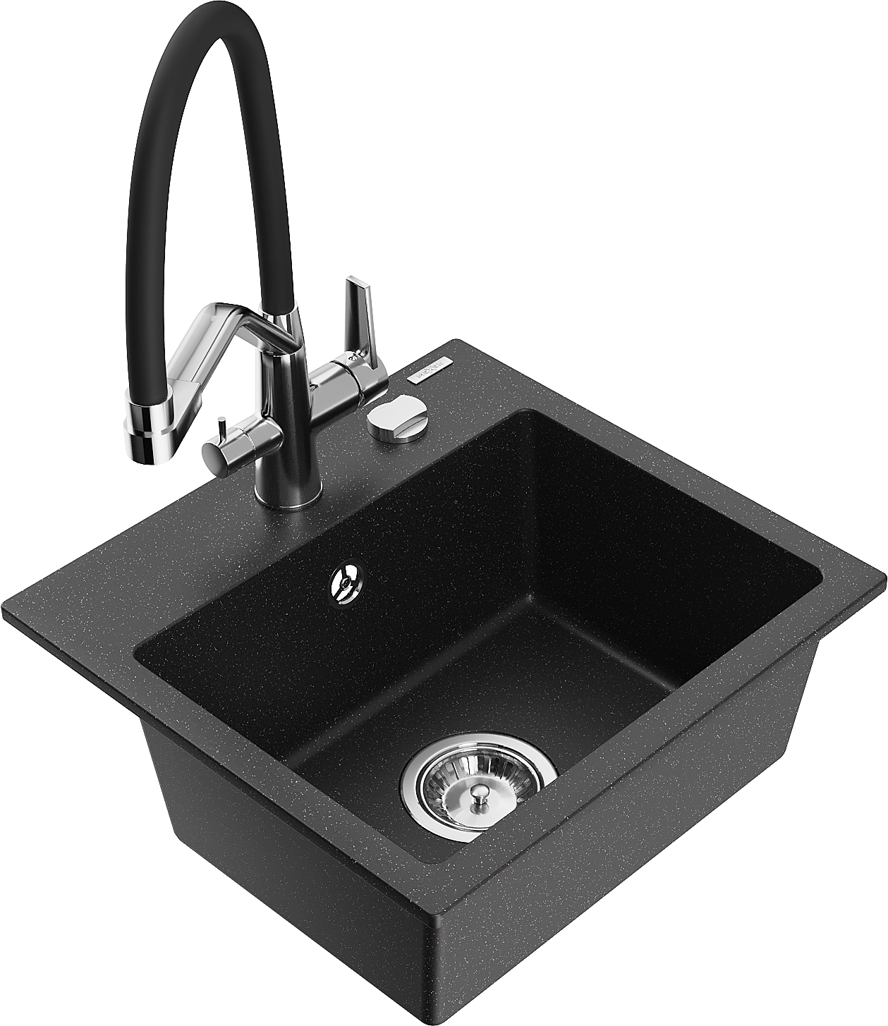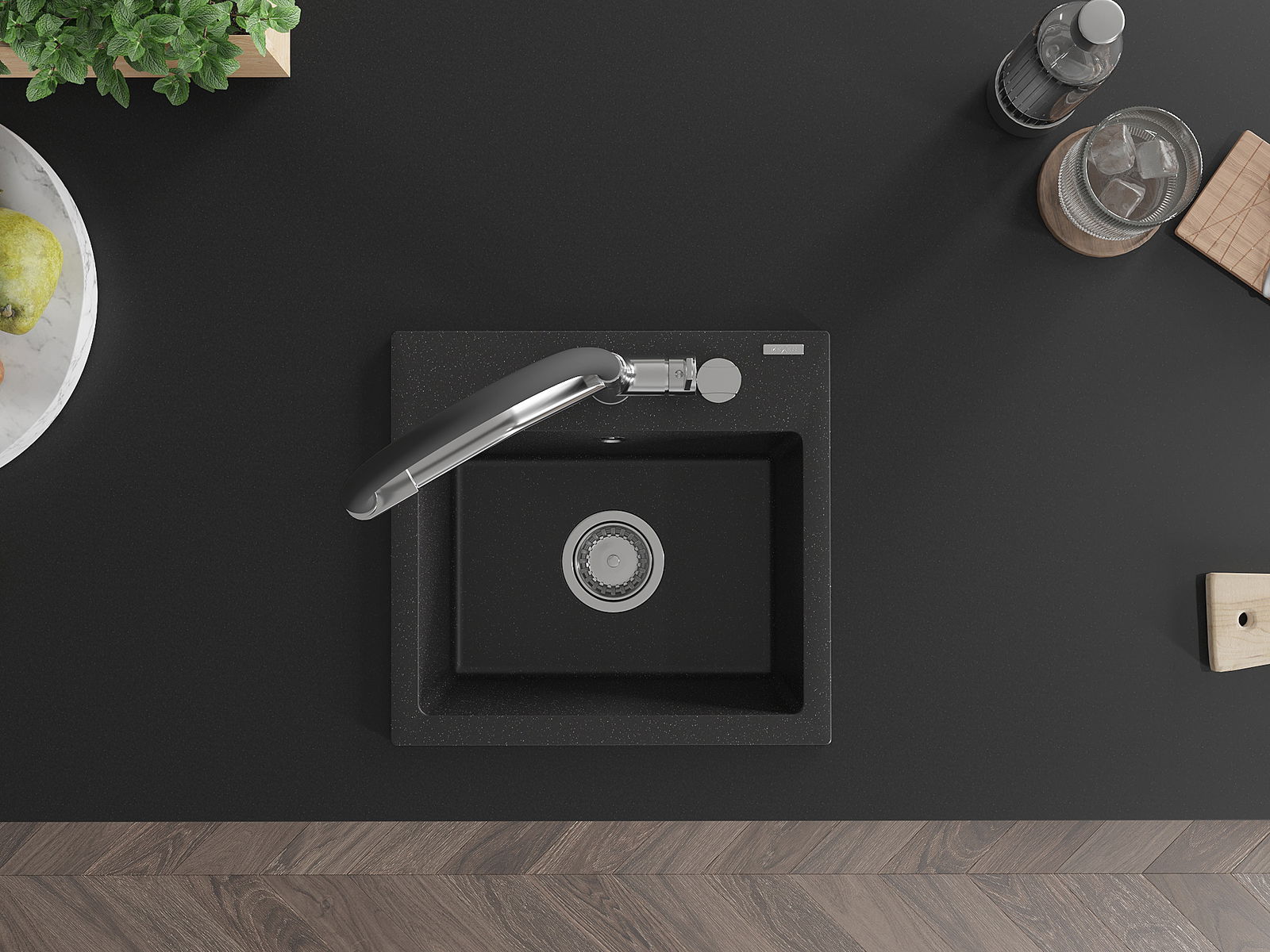 Mexen Milo granite sink 1-bowl with Duo kitchen tap, black/silver metallic - 6505-73-671701-07