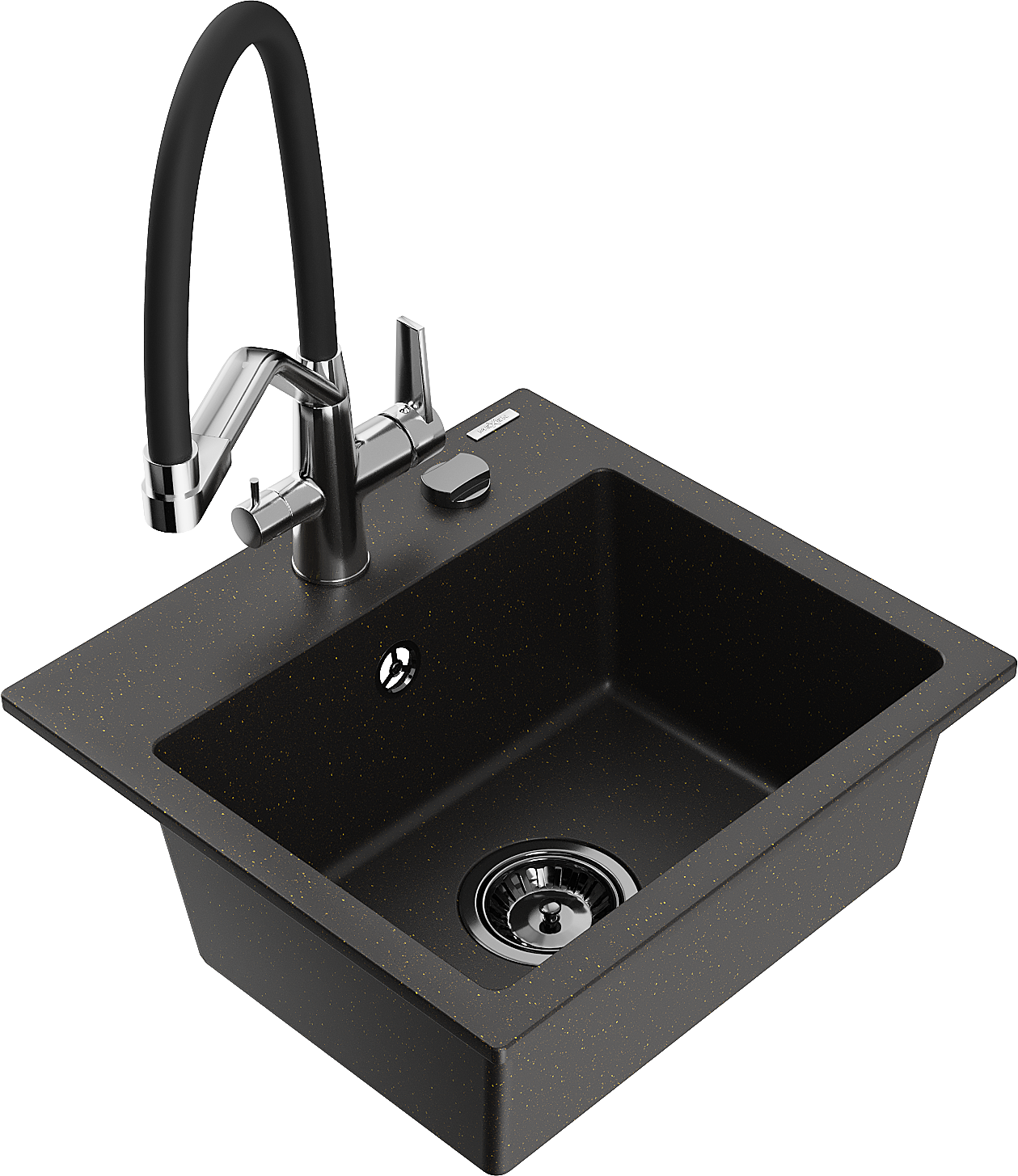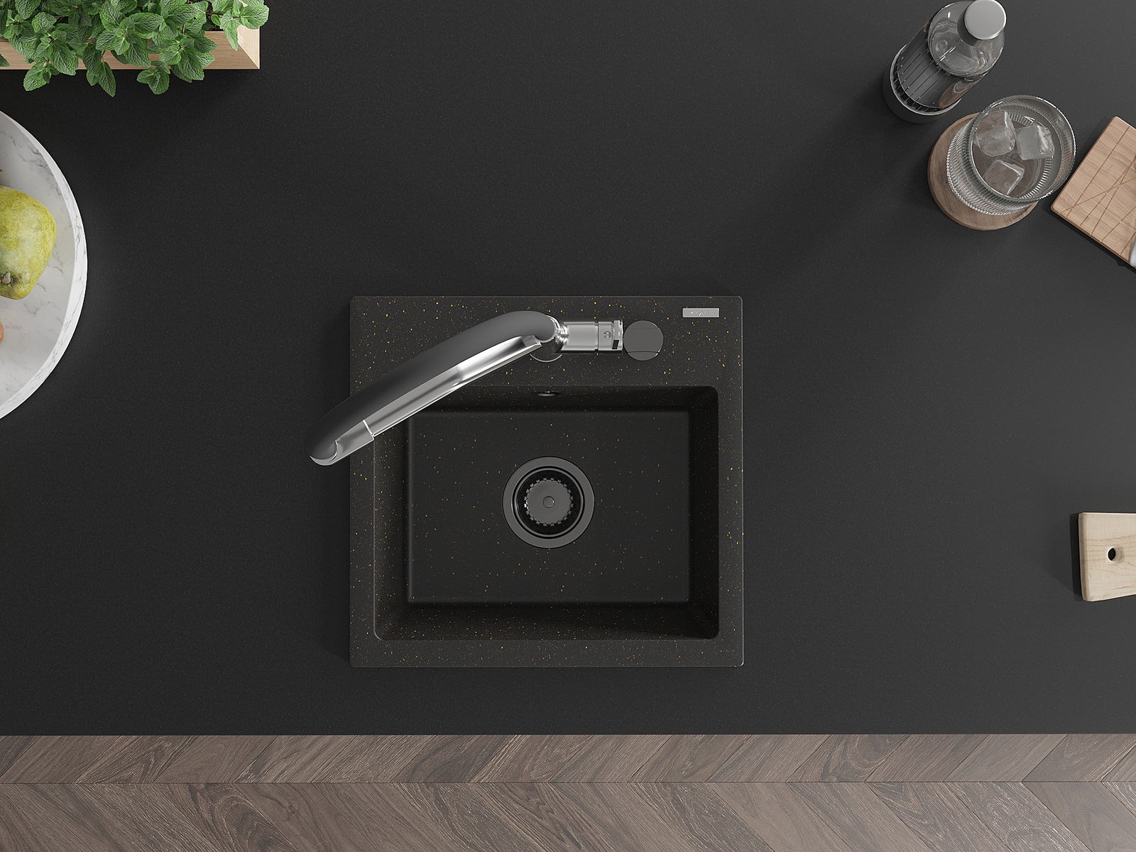 Mexen Milo granite sink 1-bowl with Duo kitchen tap, black/gold metallic - 6505-75-671701-07-B