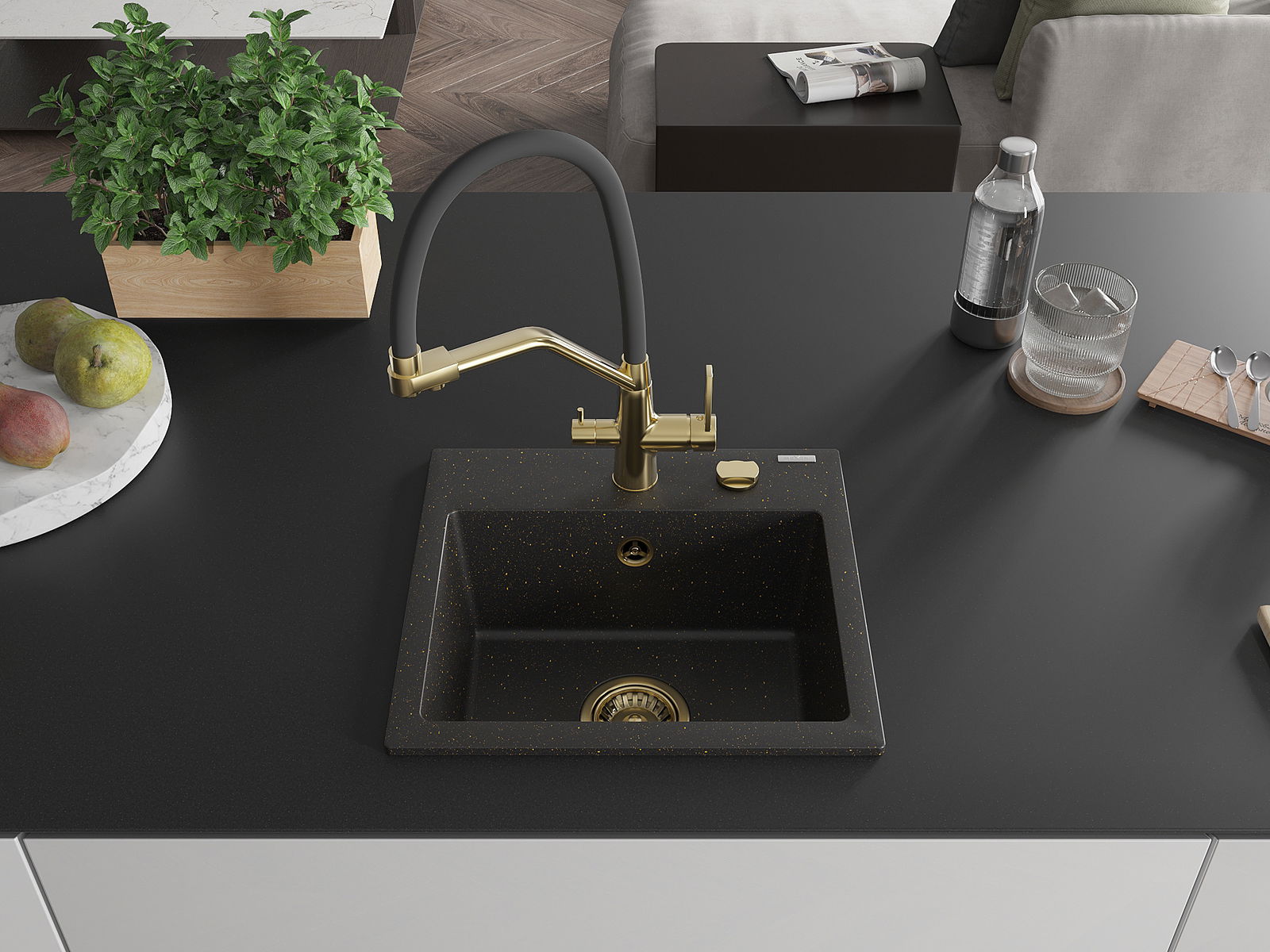 Mexen Milo single-bowl granite kitchen sink with Duo tap, black/gold metallic - 6505-75-671701-57-G