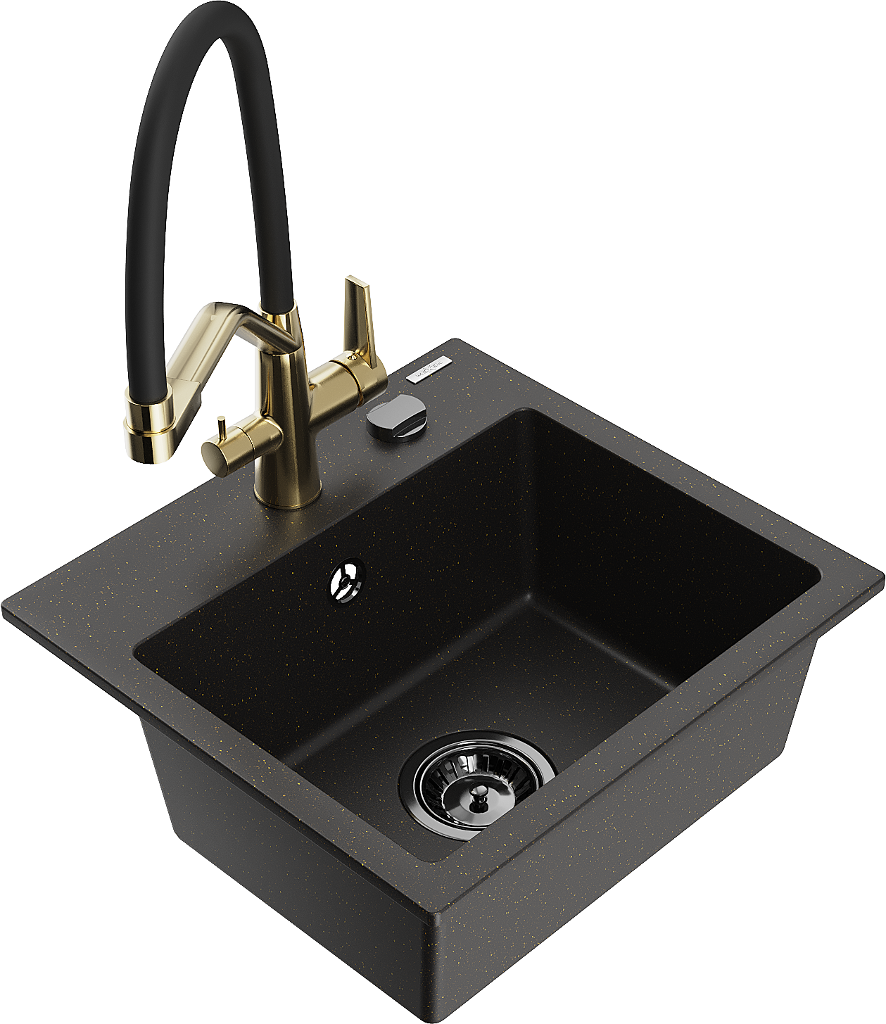 Mexen Milo granite sink 1-bowl with Duo kitchen tap, black/gold metallic - 6505-75-671701-57-B