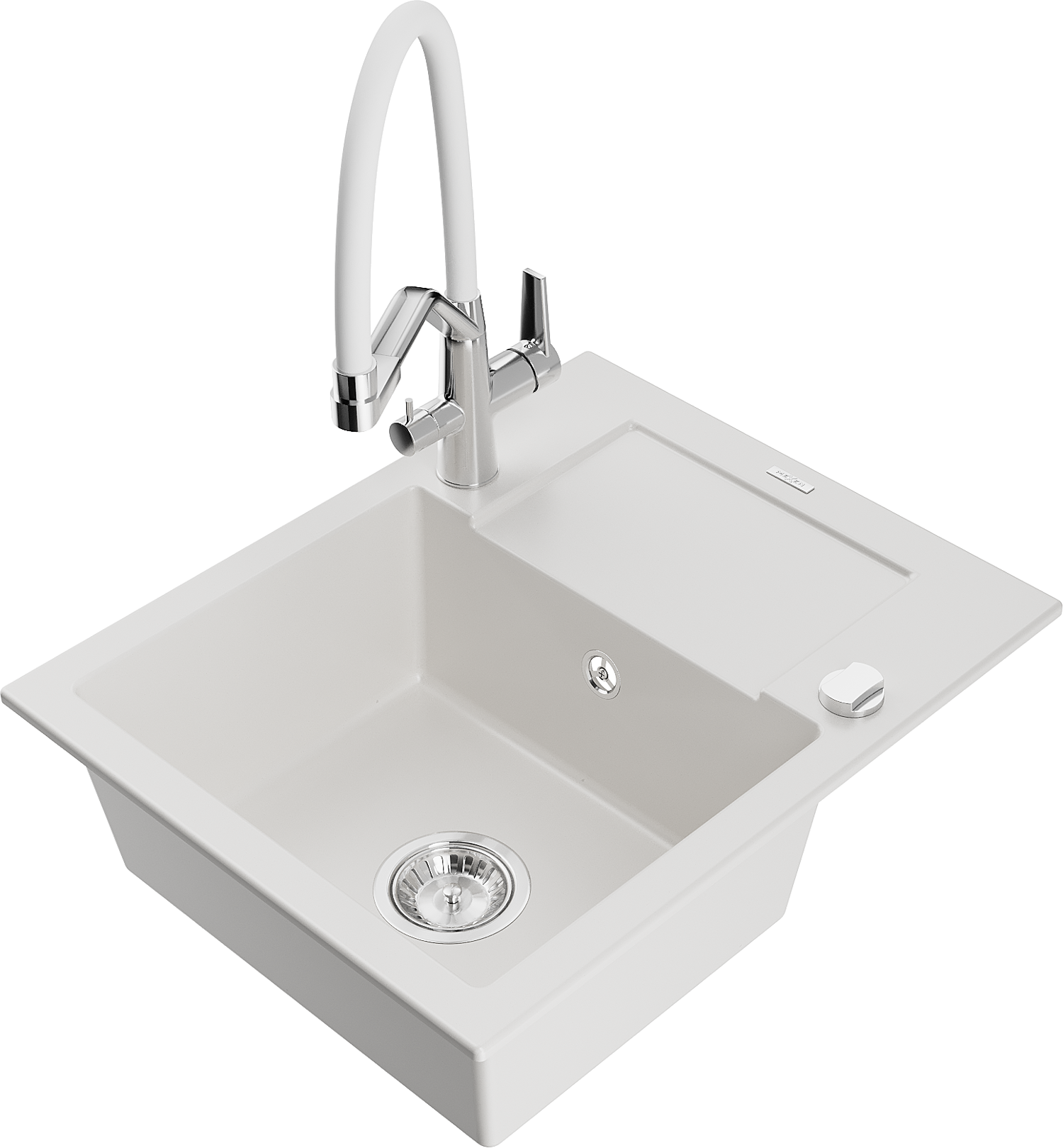 Mexen Enzo 1-bowl granite sink with drainer and Duo kitchen tap, white - 6506-20-671701-02