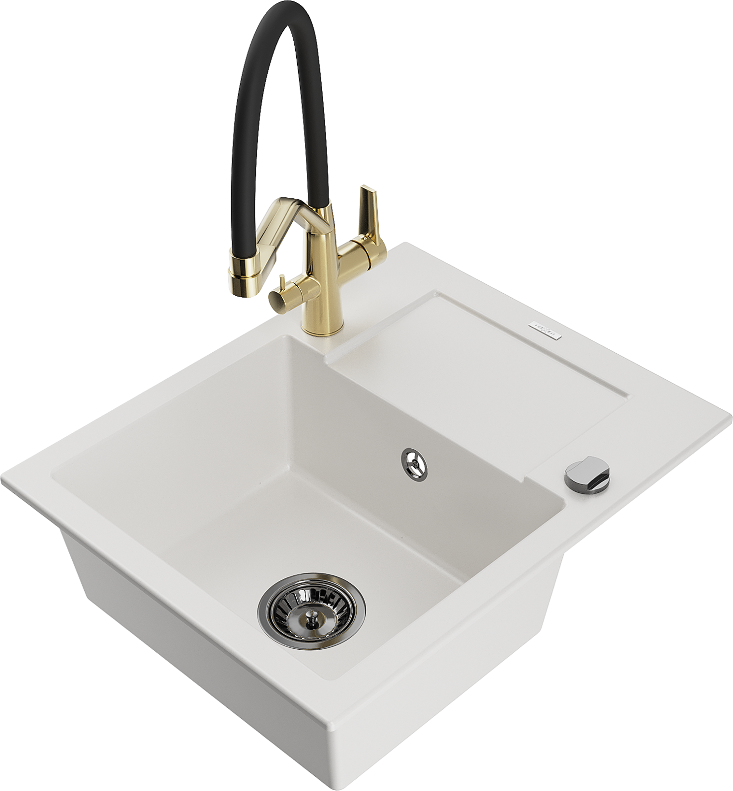Mexen Enzo granite sink 1-bowl with drainer and Duo kitchen tap, white - 6506-20-671701-57-B