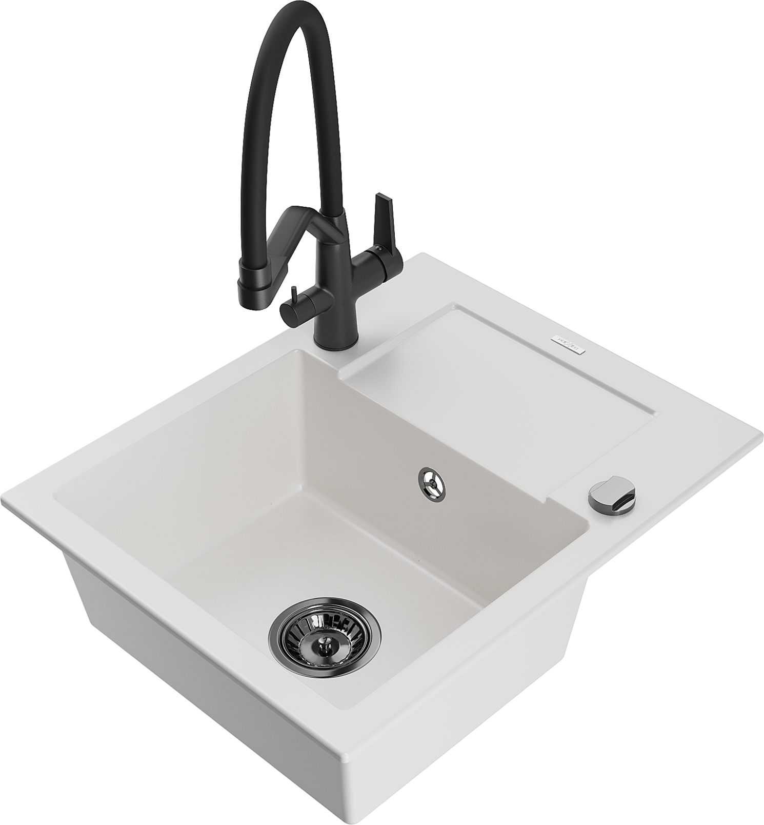 Mexen Enzo 1-bowl granite sink with drainer and Duo kitchen tap, white - 6506-20-671701-70-B