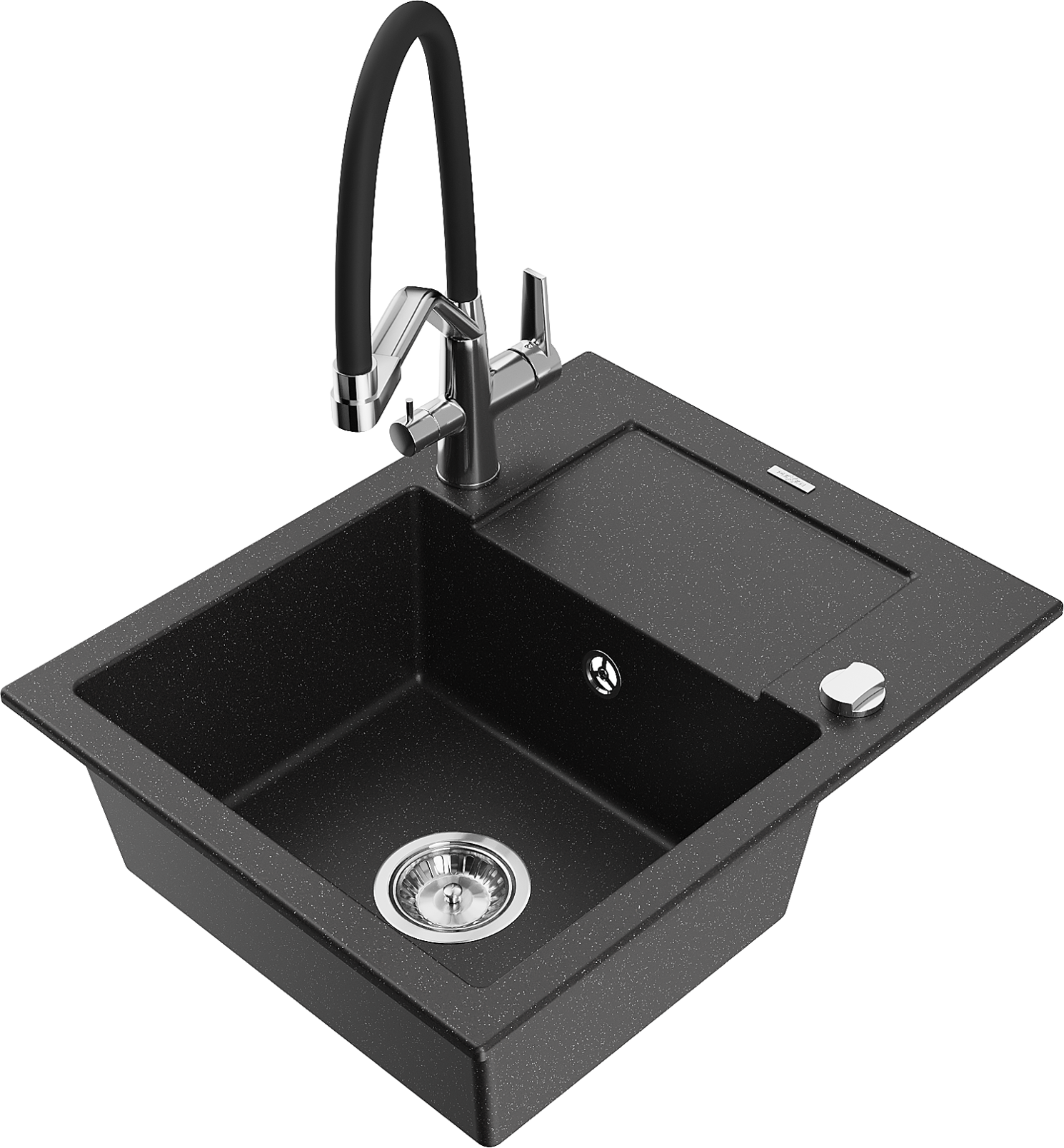 Mexen Enzo granite sink 1-bowl with drainer and Duo kitchen tap, black/silver metallic - 6506-73-671701-07