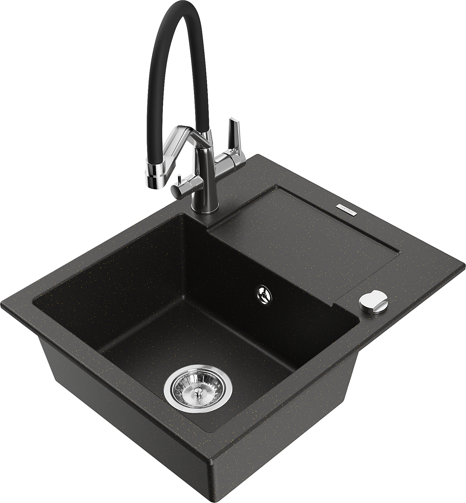 Mexen Enzo granite sink 1-bowl with drainer and Duo kitchen tap, black/gold metallic - 6506-75-671701-07