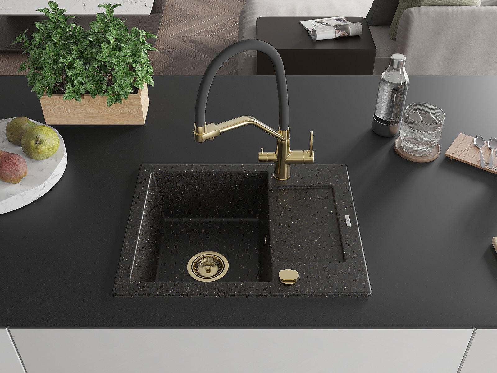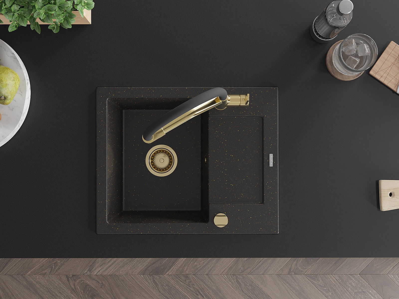 Mexen Enzo granite sink with 1 bowl, drainer, and Duo kitchen tap, black/gold metallic - 6506-75-671701-57-G