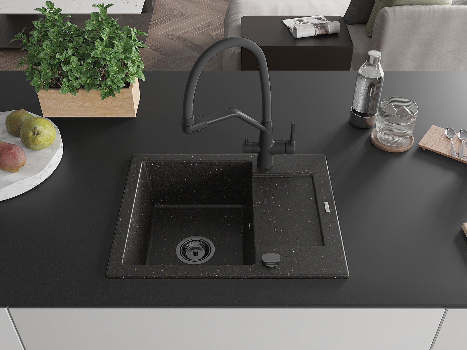 Mexen Enzo 1-bowl Granite Sink with Drainer and Duo Kitchen Tap, Black/Gold Metallic - 6506-75-671701-70-B