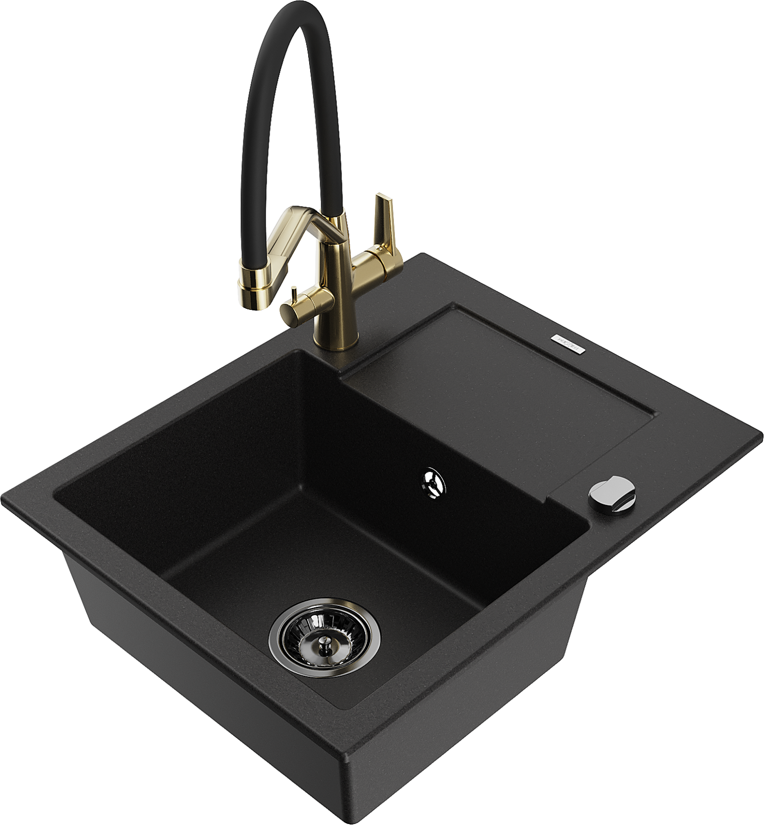 Mexen Enzo granite sink 1-bowl with drainer and Duo kitchen tap, black - 6506-77-671701-57-B