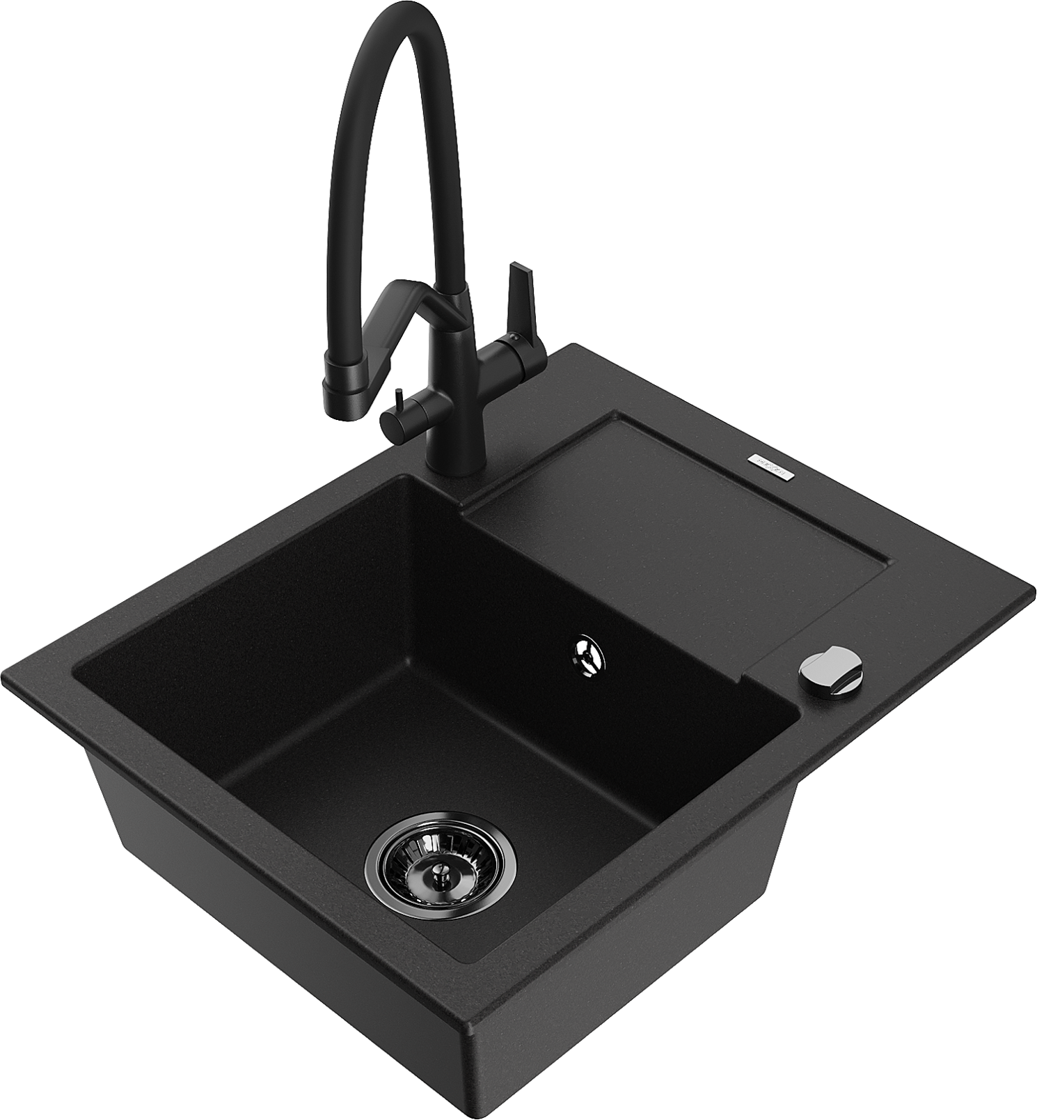 Mexen Enzo granite sink single-bowl with drainer and Duo kitchen tap, black - 6506-77-671701-70-B