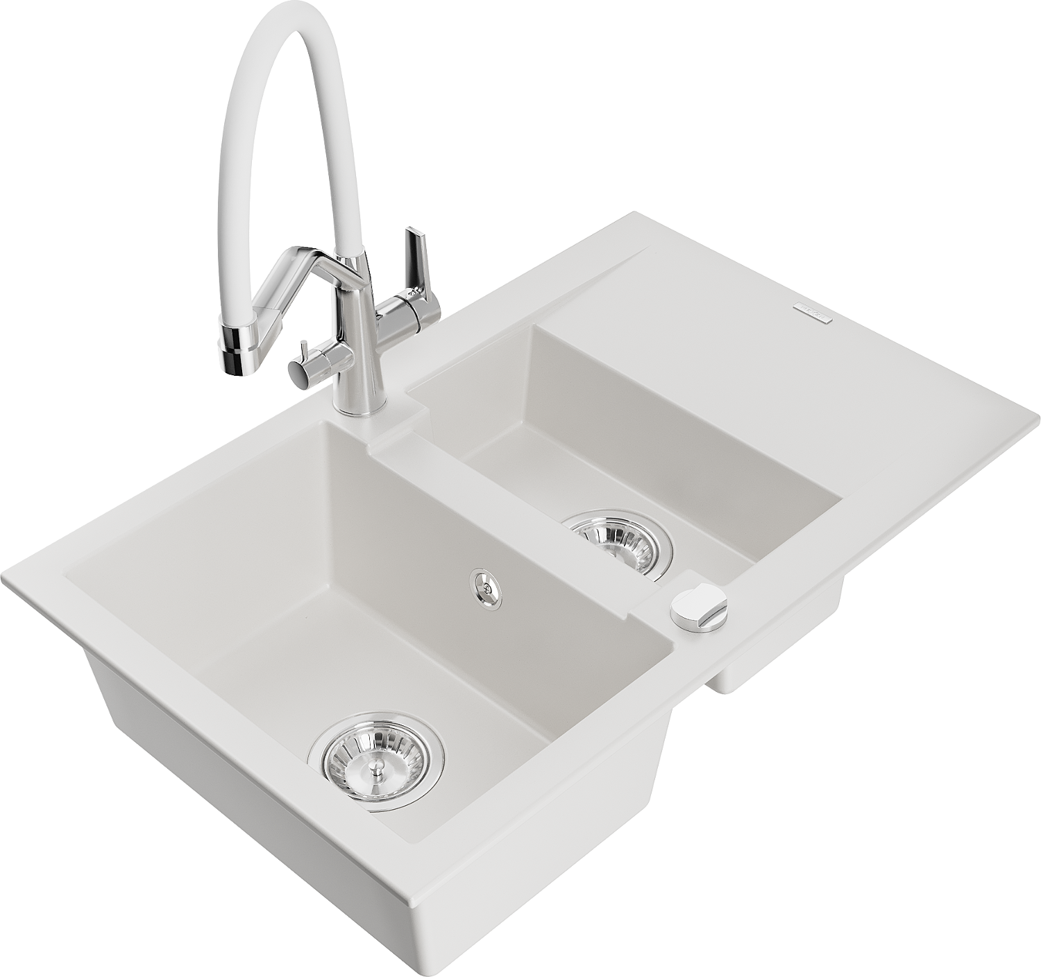 Mexen Gaspar granite sink 1.5-bowl with drainer and Duo kitchen tap, white - 6507-20-671701-02