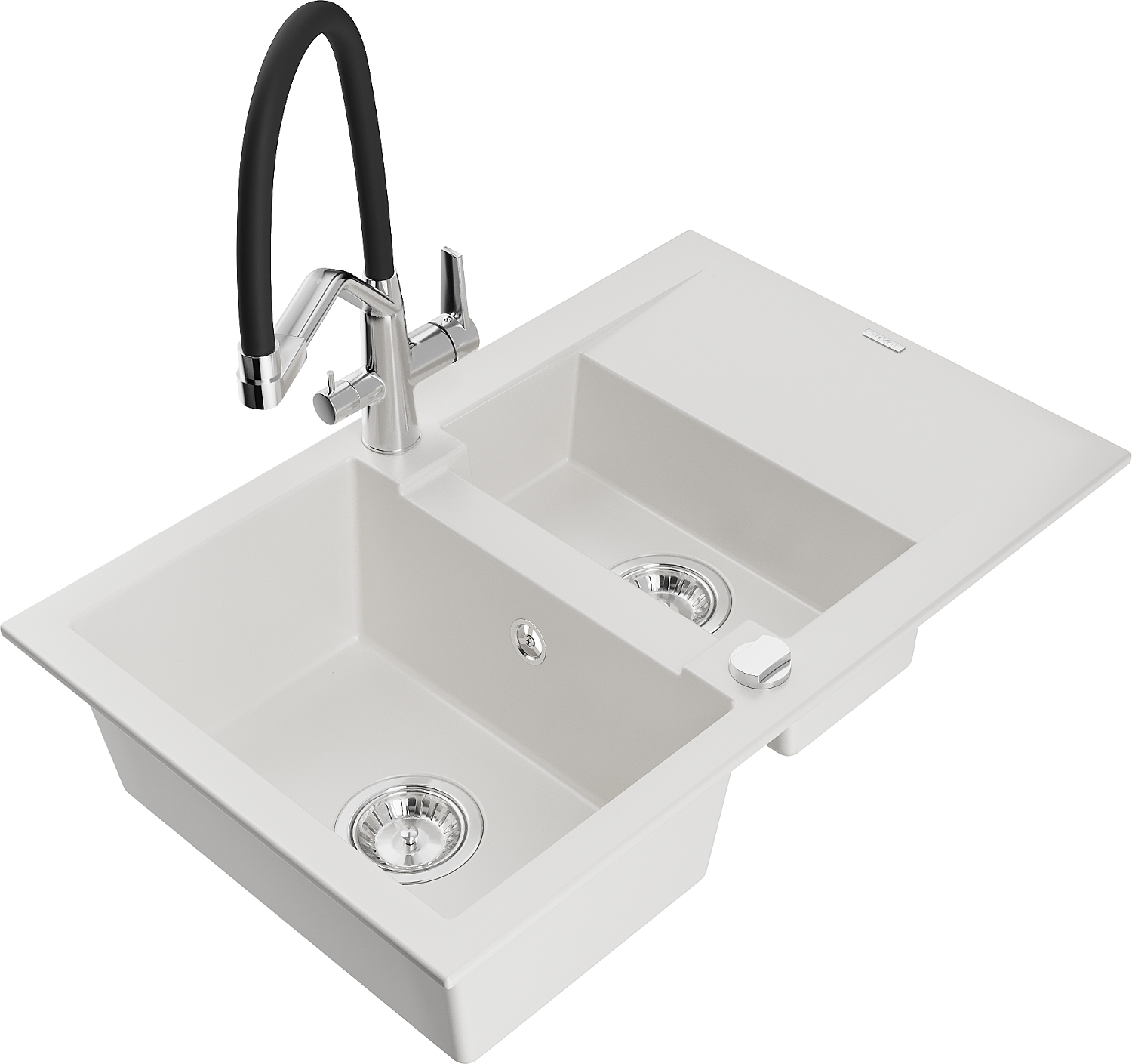 Mexen Gaspar granite sink 1.5-bowl with drainer and Duo kitchen tap, white - 6507-20-671701-07