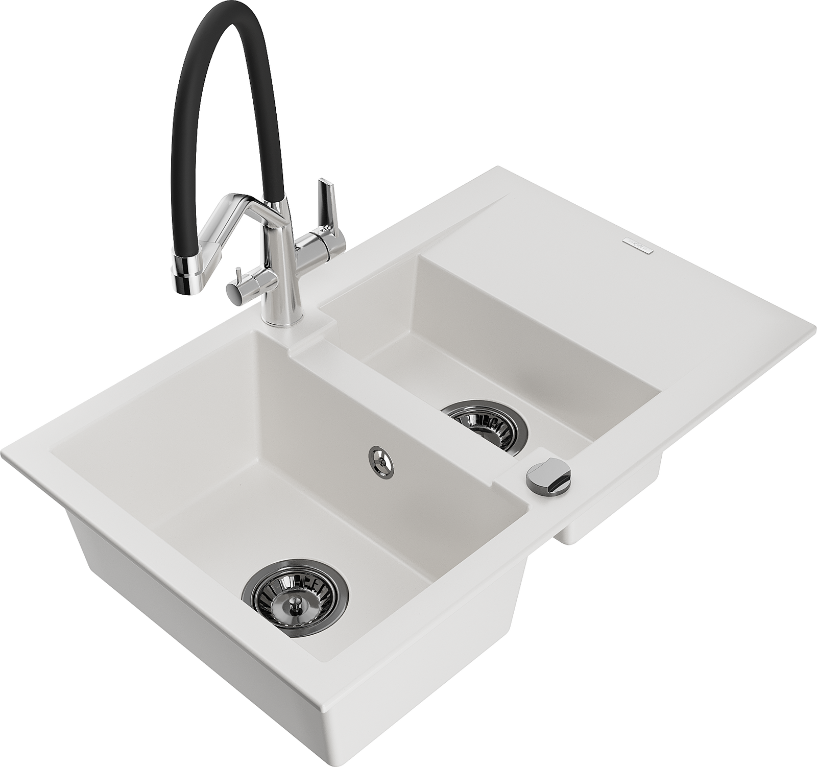 Mexen Gaspar granite sink 1.5-bowl with drainer and Duo kitchen tap, white - 6507-20-671701-07-B