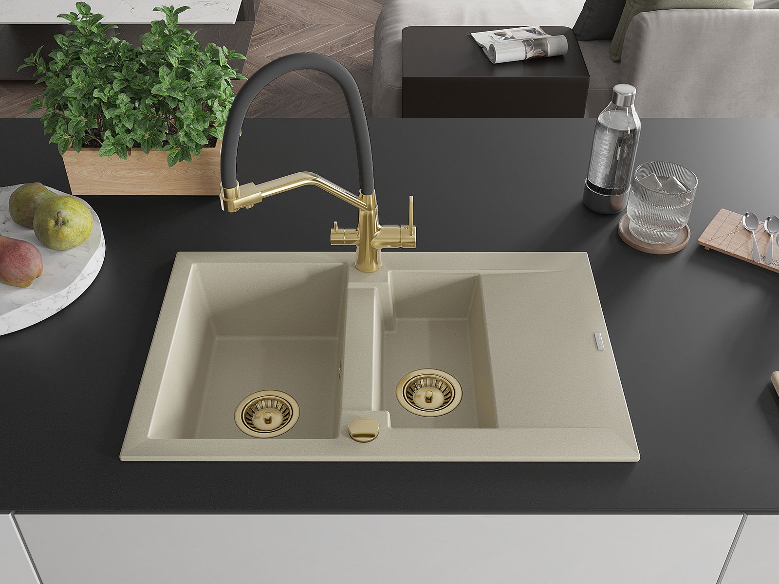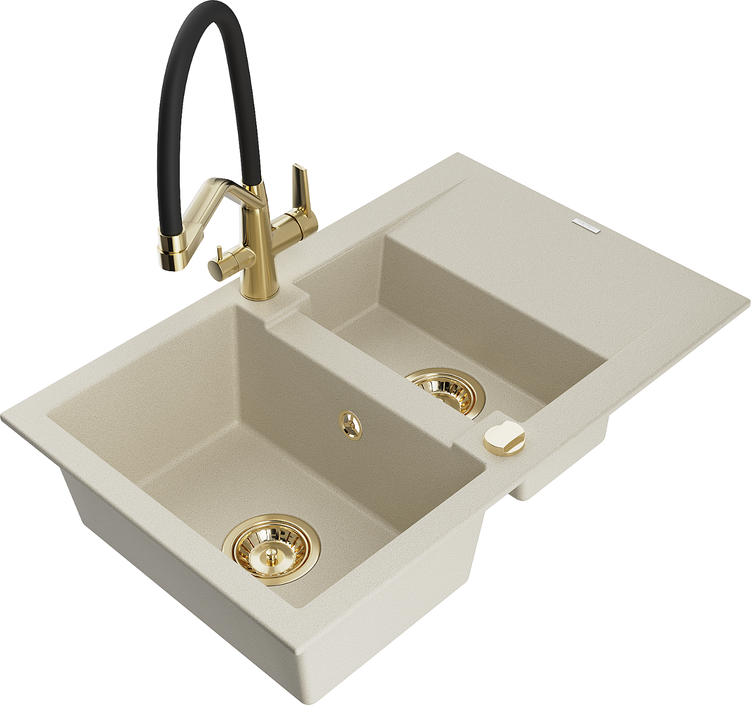Mexen Gaspar granite sink, 1.5-bowl with drainer and Duo kitchen tap, beige - 6507-69-671701-57-G