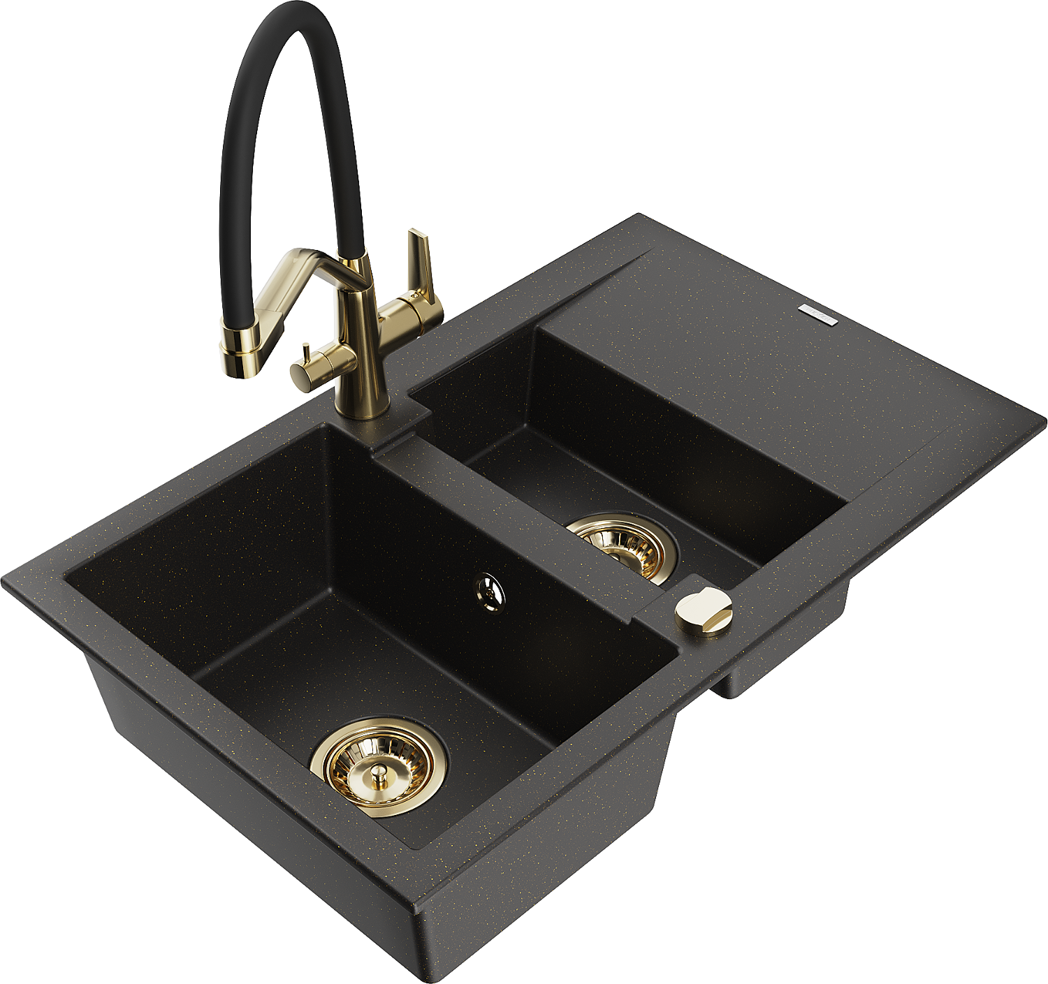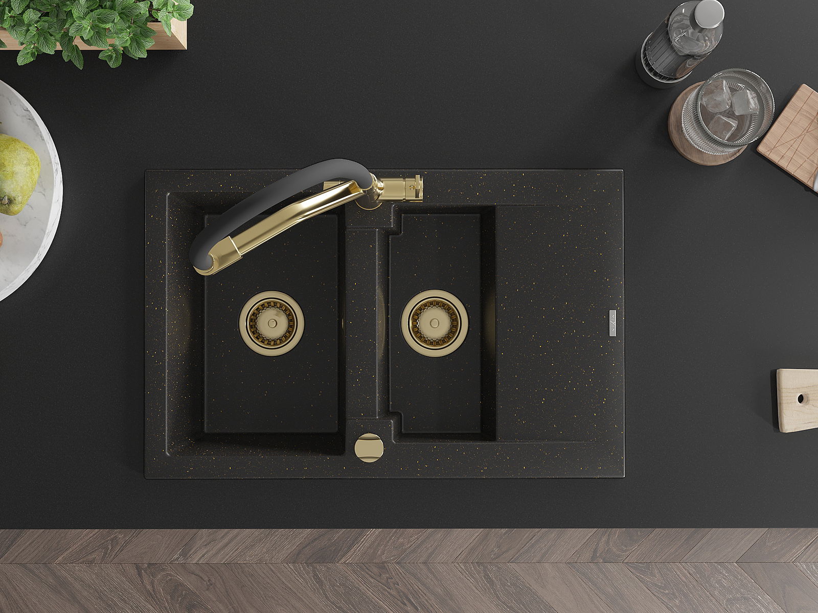 Mexen Gaspar granite kitchen sink 1.5-bowl with drainer and Duo kitchen tap, black/gold metallic - 6507-75-671701-57-G
