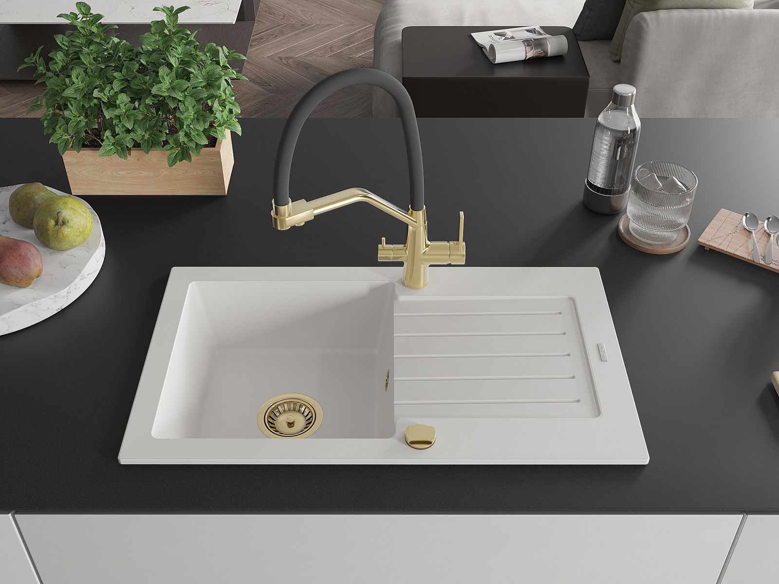 The sink is made of high quality granite. It is an elegant and, above all, practical complement to every kitchen, regardless of its style. High quality and granite durability ensure many years of use.