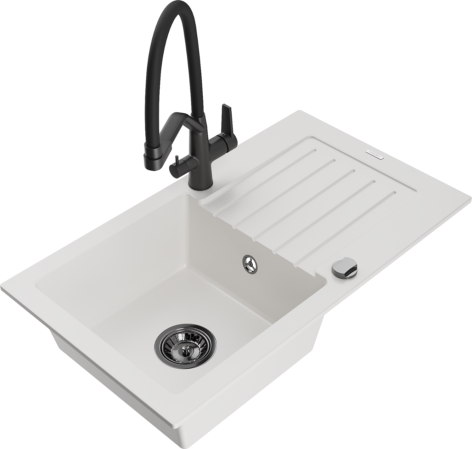 Mexen Pablo 1-bowl granite sink with drainer and Duo kitchen tap, white - 6510-20-671701-70-B