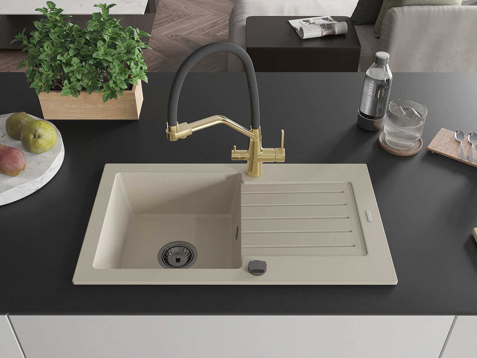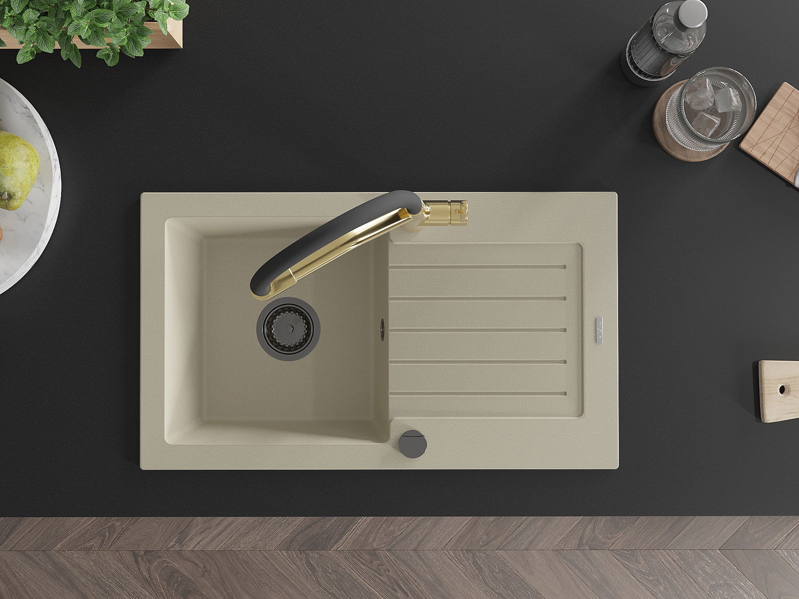 Mexen Pablo 1-bowl granite kitchen sink with drainer and Duo kitchen tap, beige - 6510-69-671701-57-B