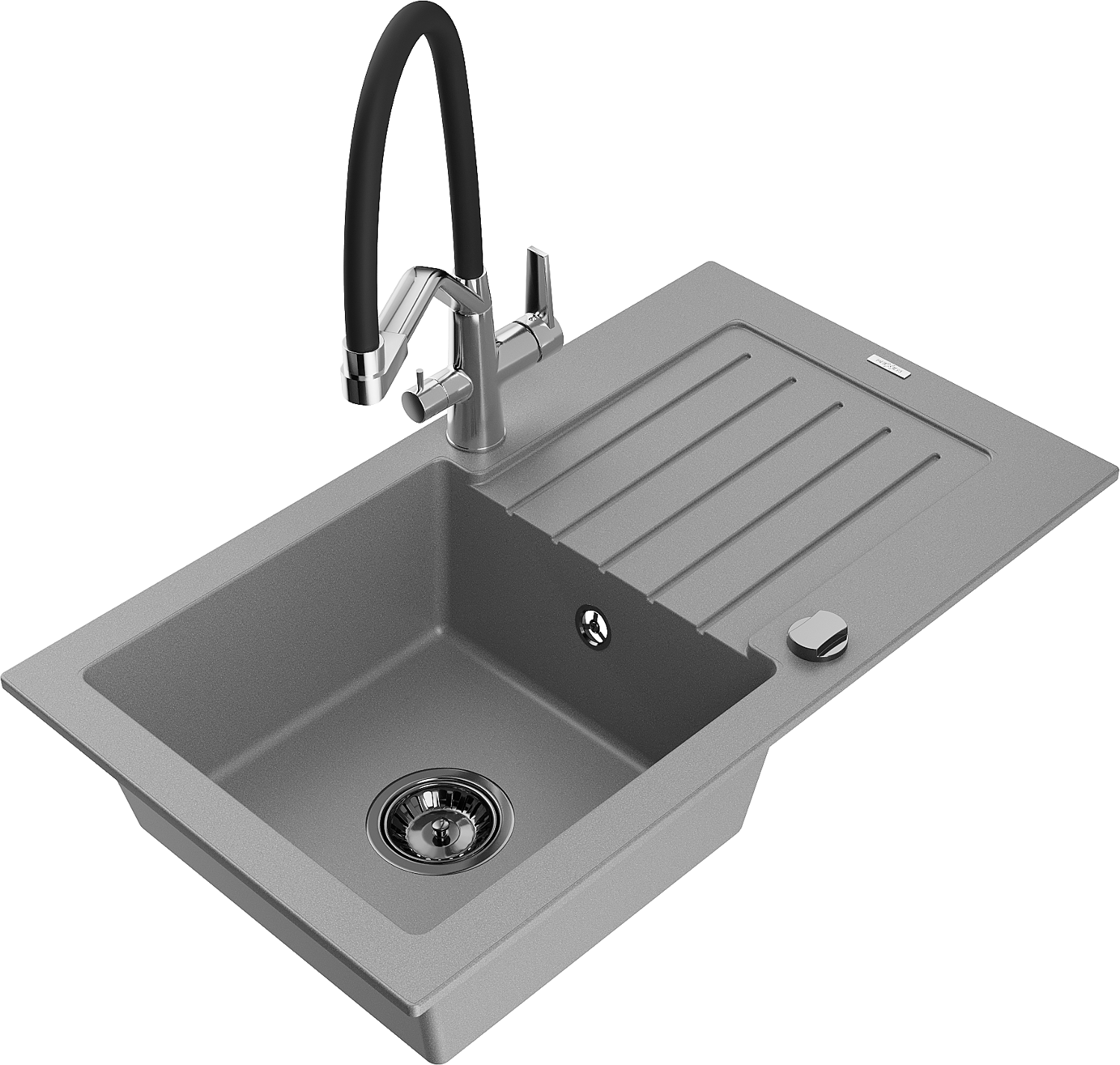 Mexen Pablo 1-bowl granite sink with drainer and Duo kitchen tap, grey - 6510-71-671701-07-B