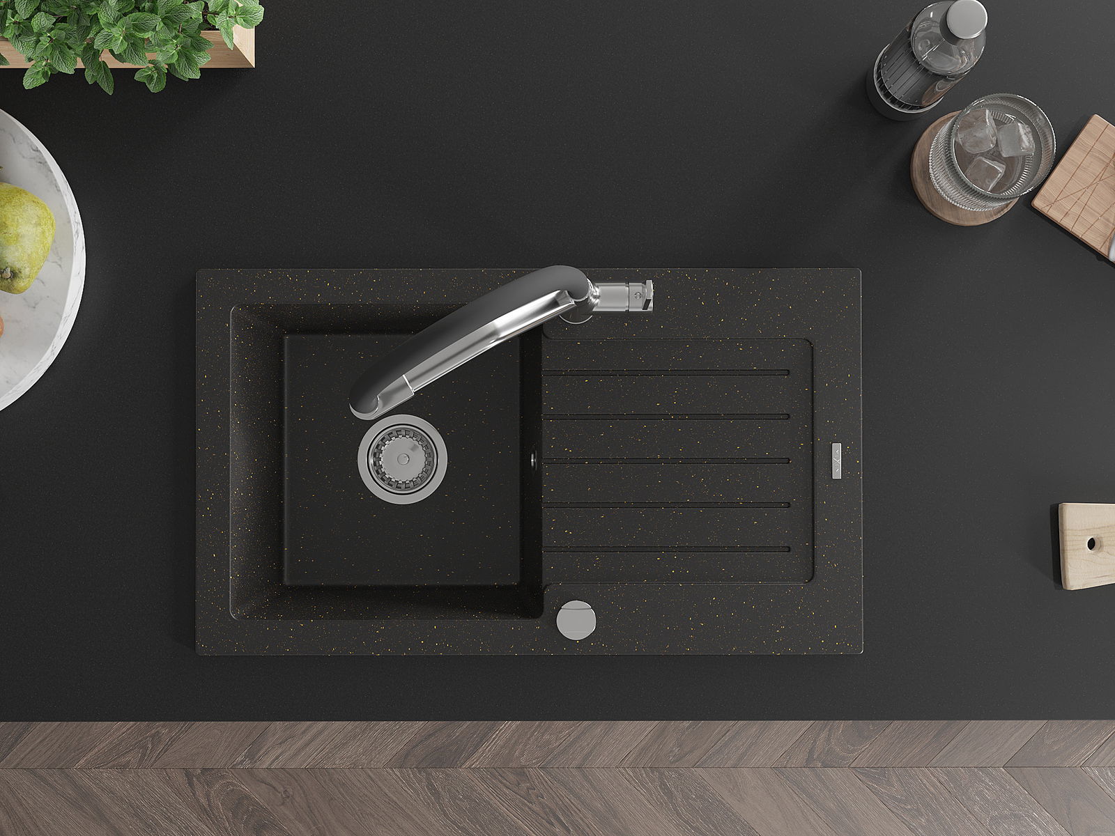 Mexen Pablo granite sink 1-bowl with drainer and Duo kitchen tap, black/gold metallic - 6510-75-671701-07