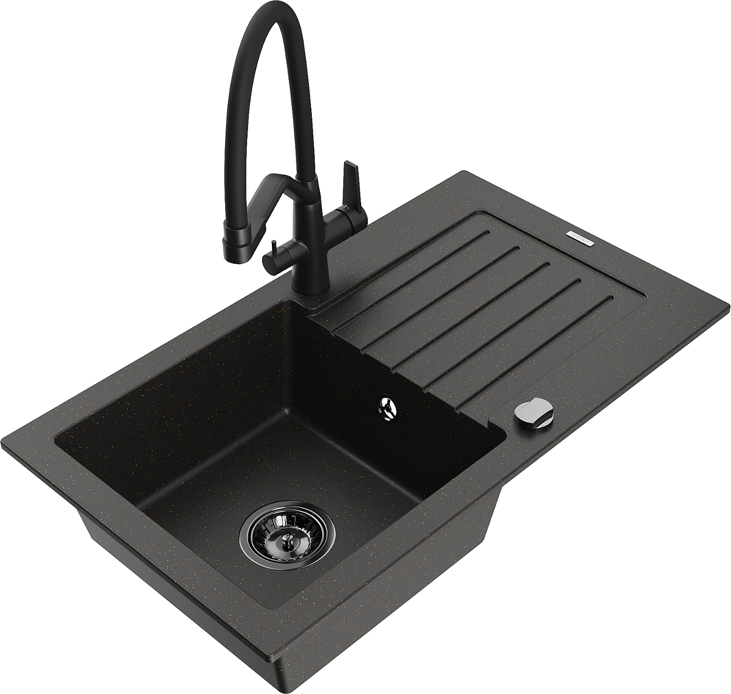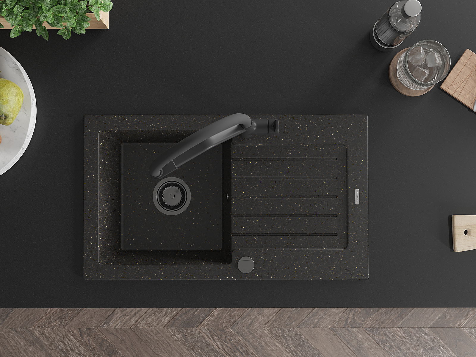 Mexen Pablo granite sink 1-bowl with drainer and kitchen tap Duo, black/gold metallic - 6510-75-671701-70-B