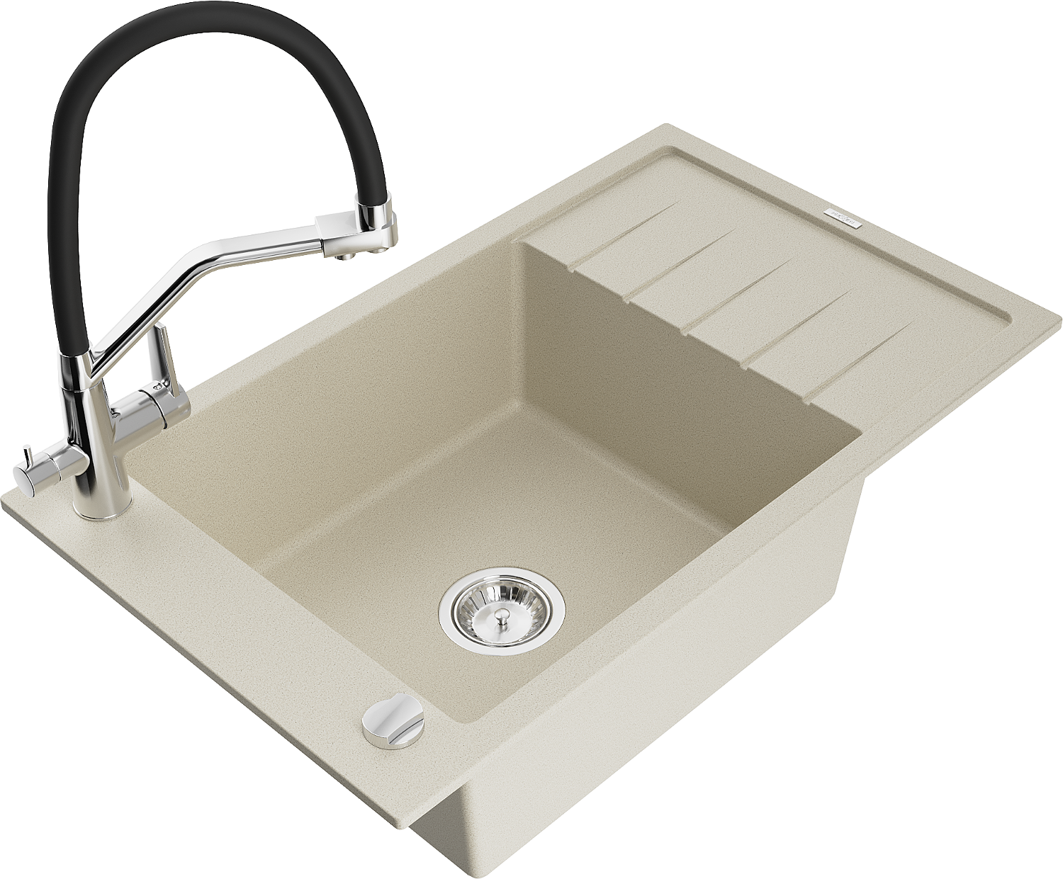 Mexen Elias granite sink 1-bowl with drainer and Duo kitchen tap, beige - 6511-69-671701-07