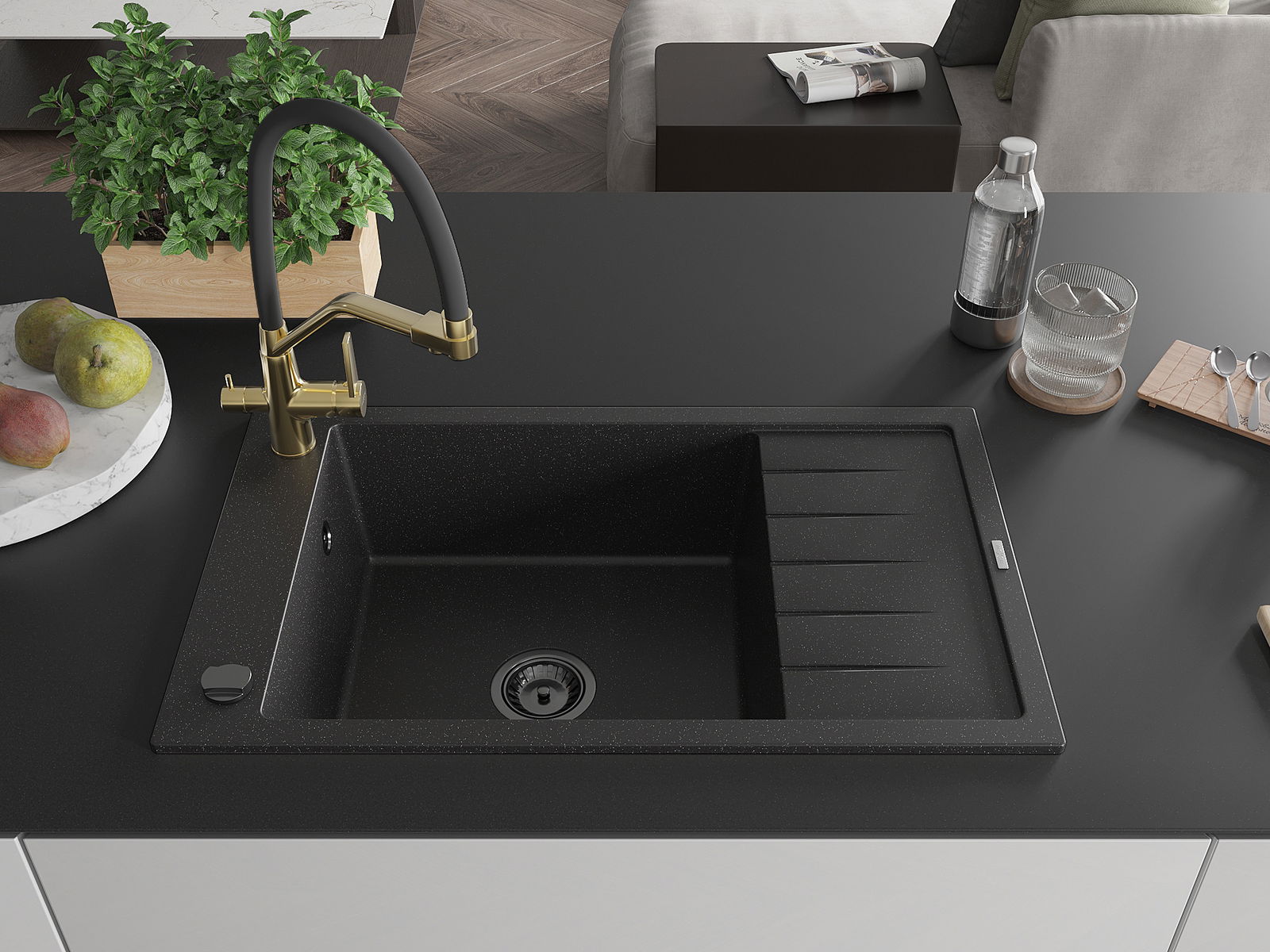 The sink is made of high quality granite. It is an elegant and, above all, practical complement to every kitchen, regardless of its style. High quality and granite durability ensure many years of use.