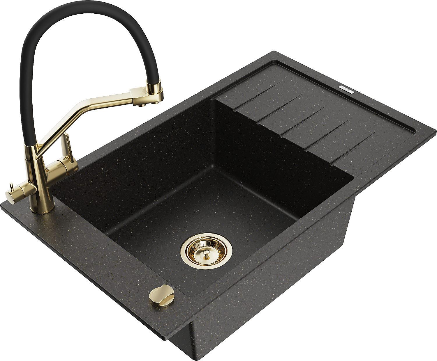 Mexen Elias granite sink 1-bowl with drainer and Duo kitchen tap, black/gold metallic - 6511-75-671701-57-G
