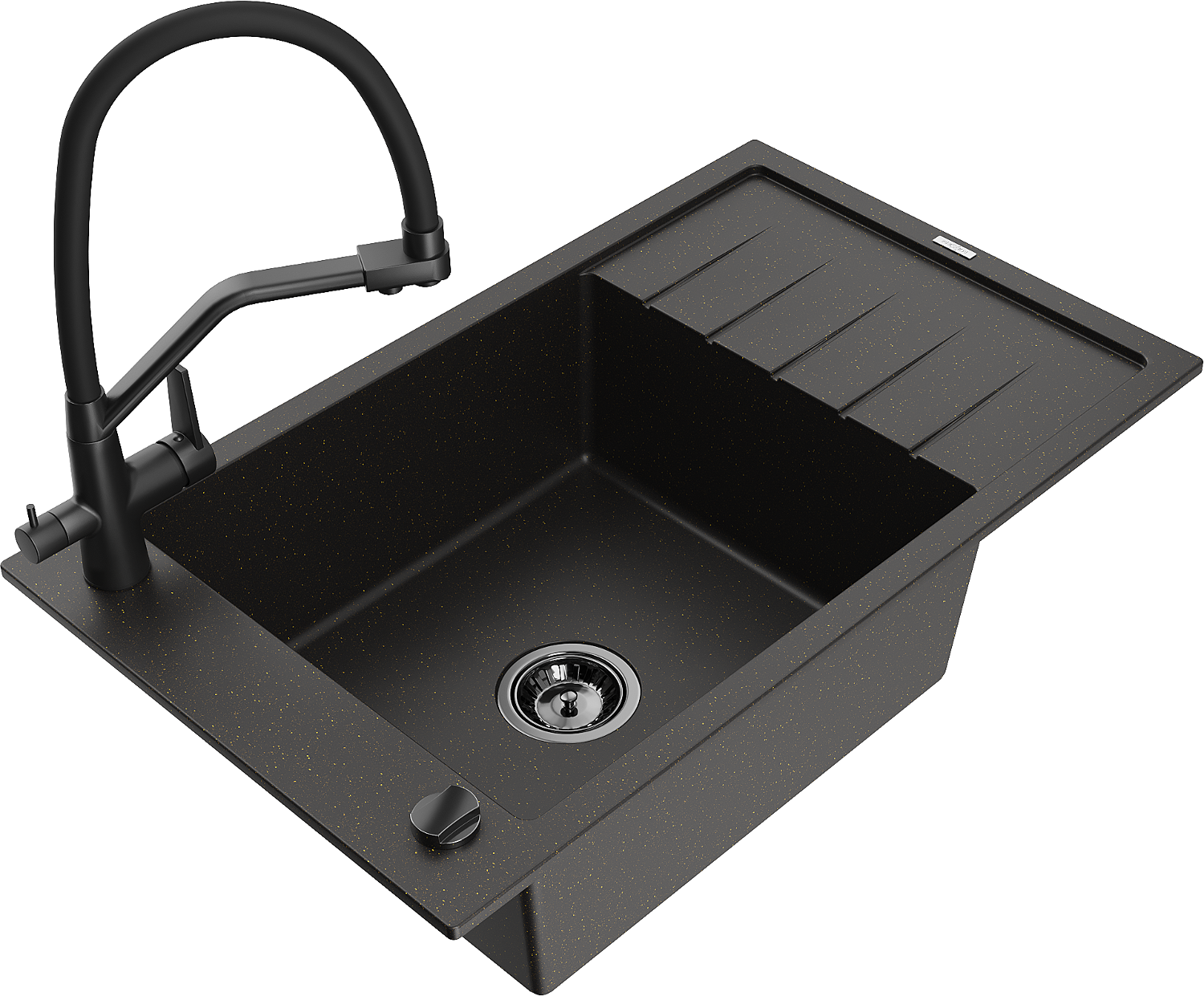 Mexen Elias 1-bowl granite sink with drainer and Duo kitchen tap, black/gold metallic - 6511-75-671701-70-B