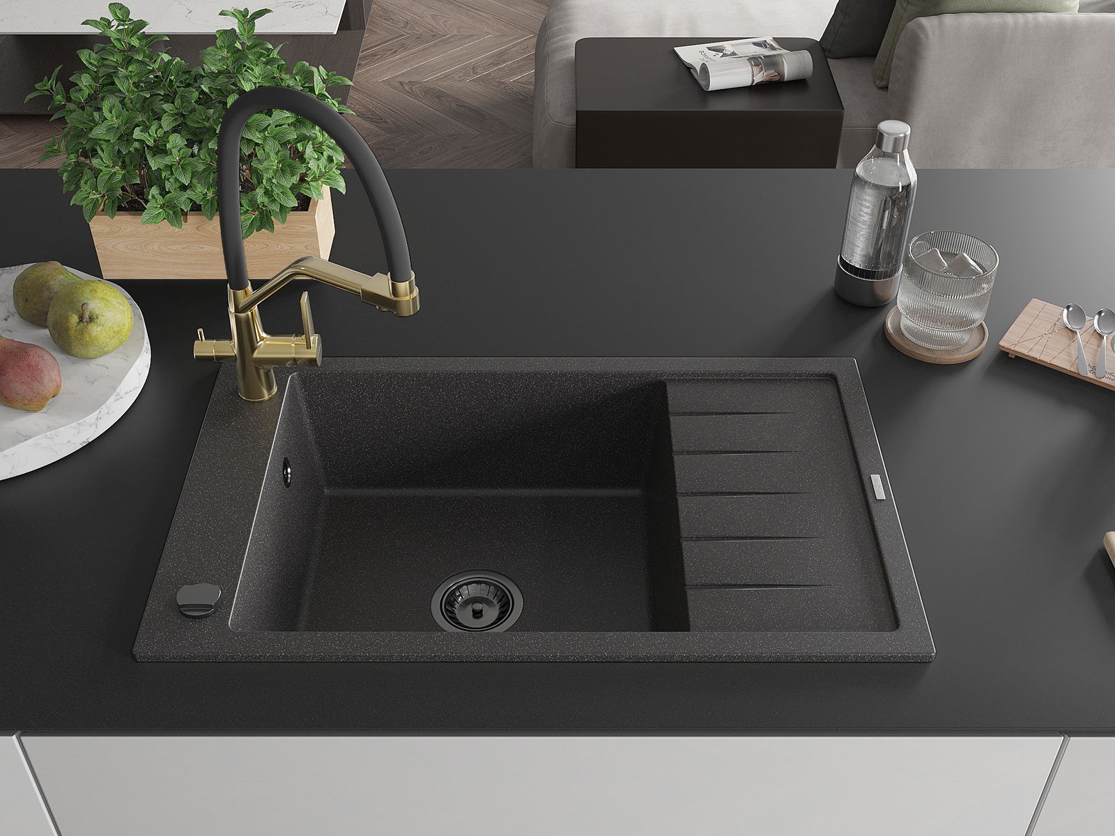 The sink is made of high quality granite. It is an elegant and, above all, practical complement to every kitchen, regardless of its style. High quality and granite durability ensure many years of use.