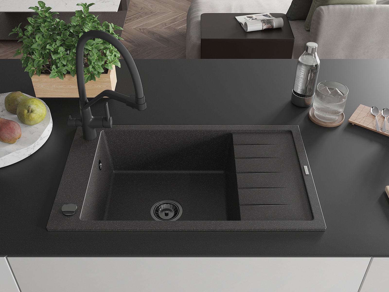 The sink is made of high quality granite. It is an elegant and, above all, practical complement to every kitchen, regardless of its style. High quality and granite durability ensure many years of use.