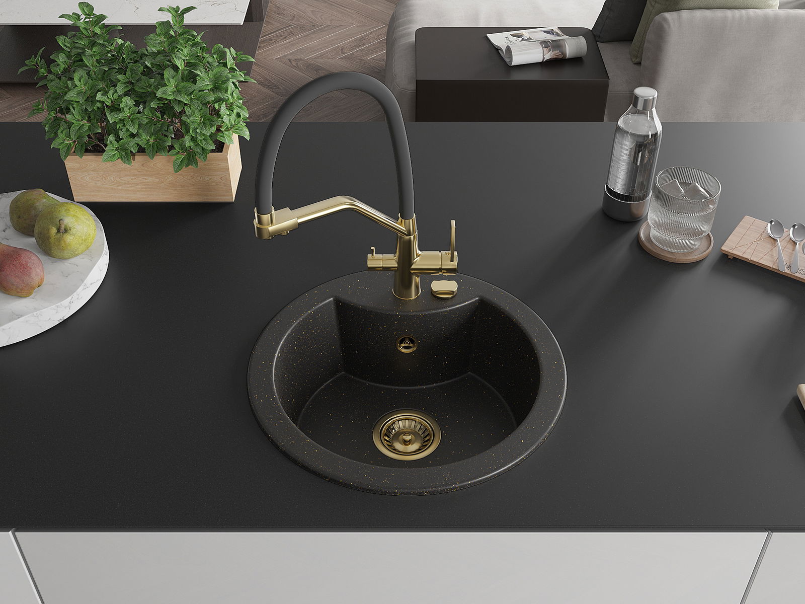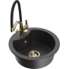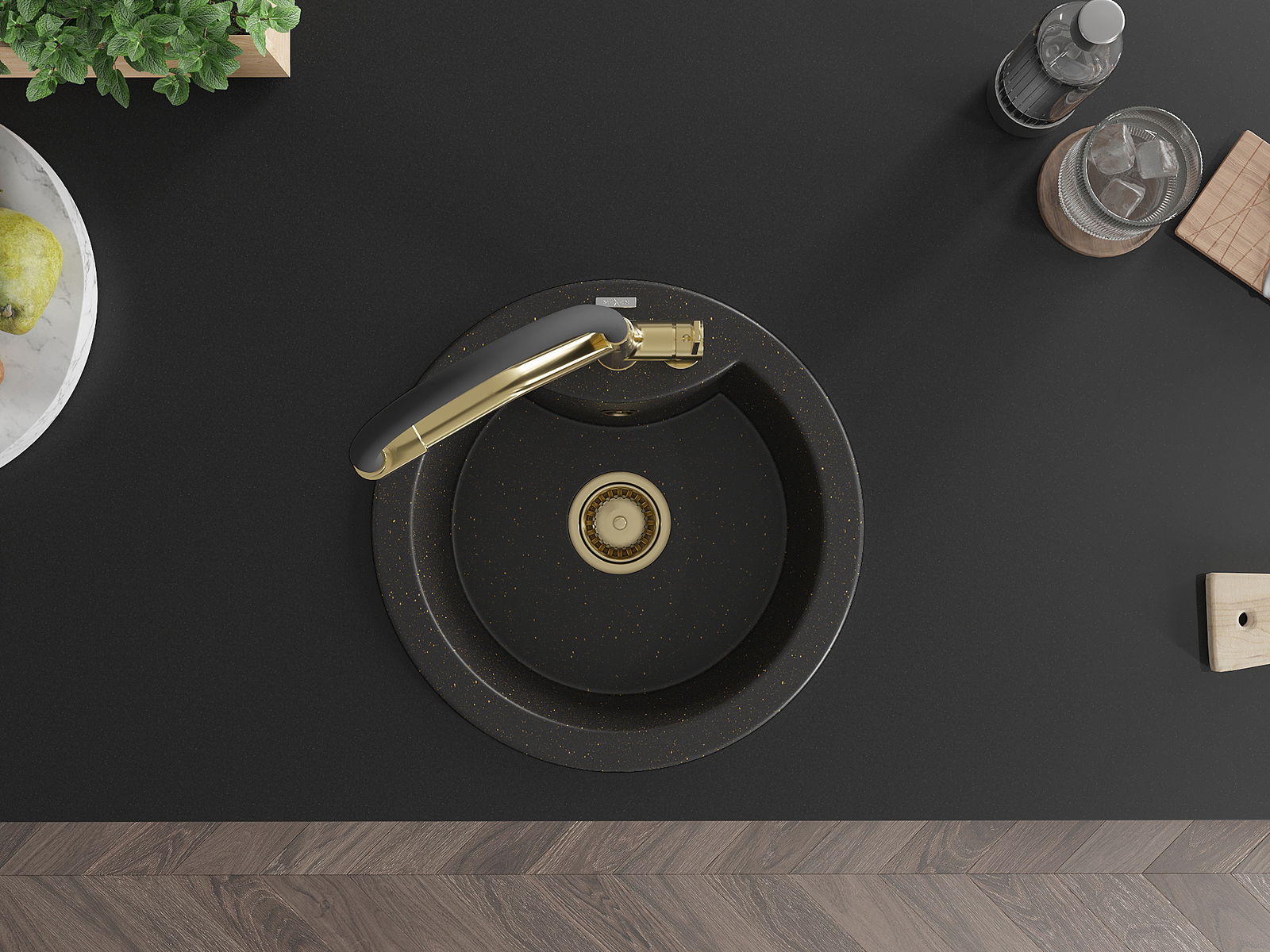 Mexen Diego Granite Sink 1-Bowl with Duo Kitchen Tap, Black/Gold Metallic - 6512-75-671701-57-G