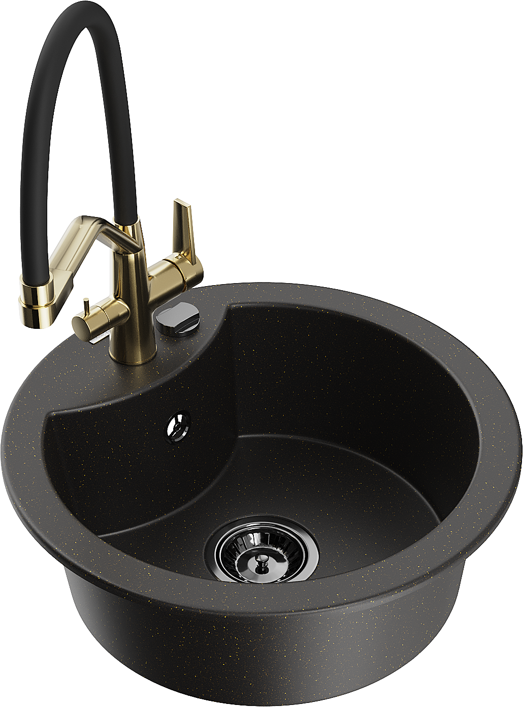 Mexen Diego granite sink 1-bowl with Duo kitchen tap, black/gold metallic - 6512-75-671701-57-B