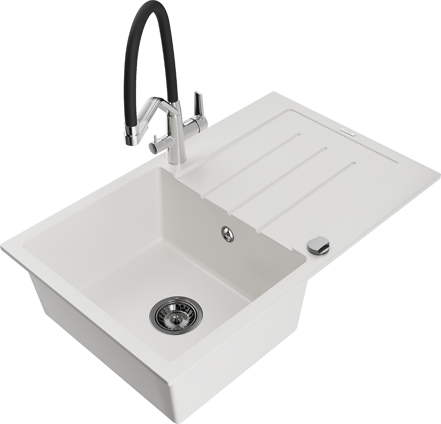 Mexen Bruno granite sink 1-bowl with drainer and Duo kitchen tap, white - 6513-20-671701-07-B