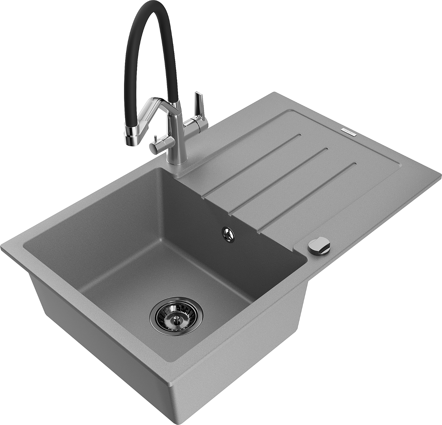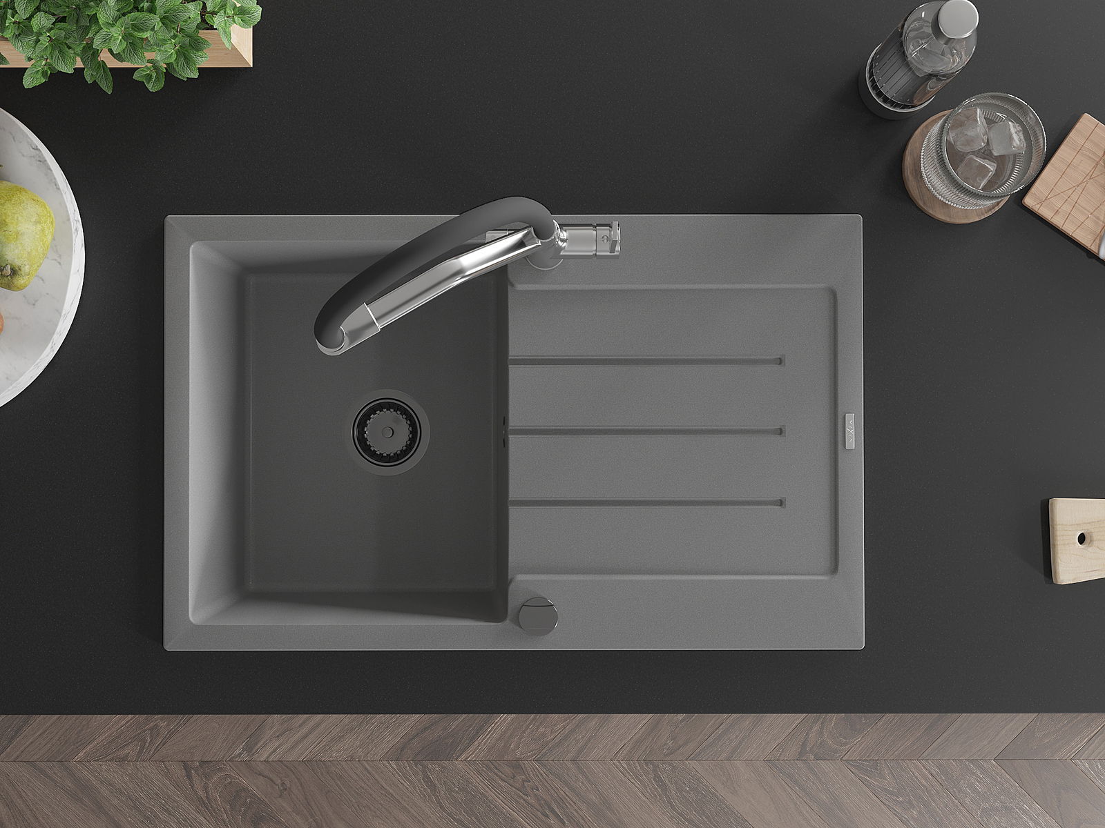 Mexen Bruno granite sink 1-bowl with drainer and Duo kitchen tap, grey - 6513-71-671701-07-B