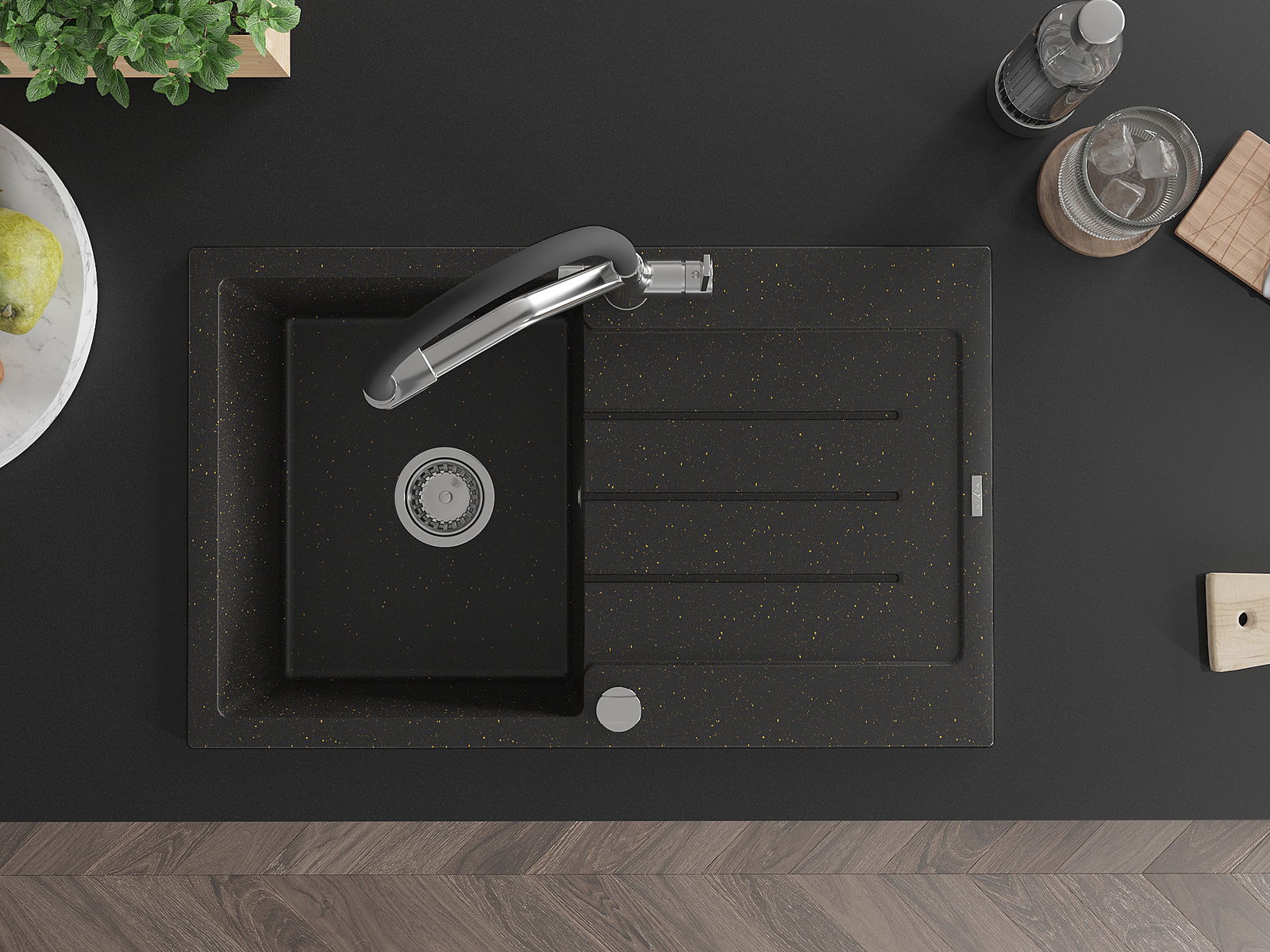 Mexen Bruno granite sink 1-bowl with drainer and Duo kitchen tap, black/gold metallic - 6513-75-671701-07