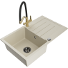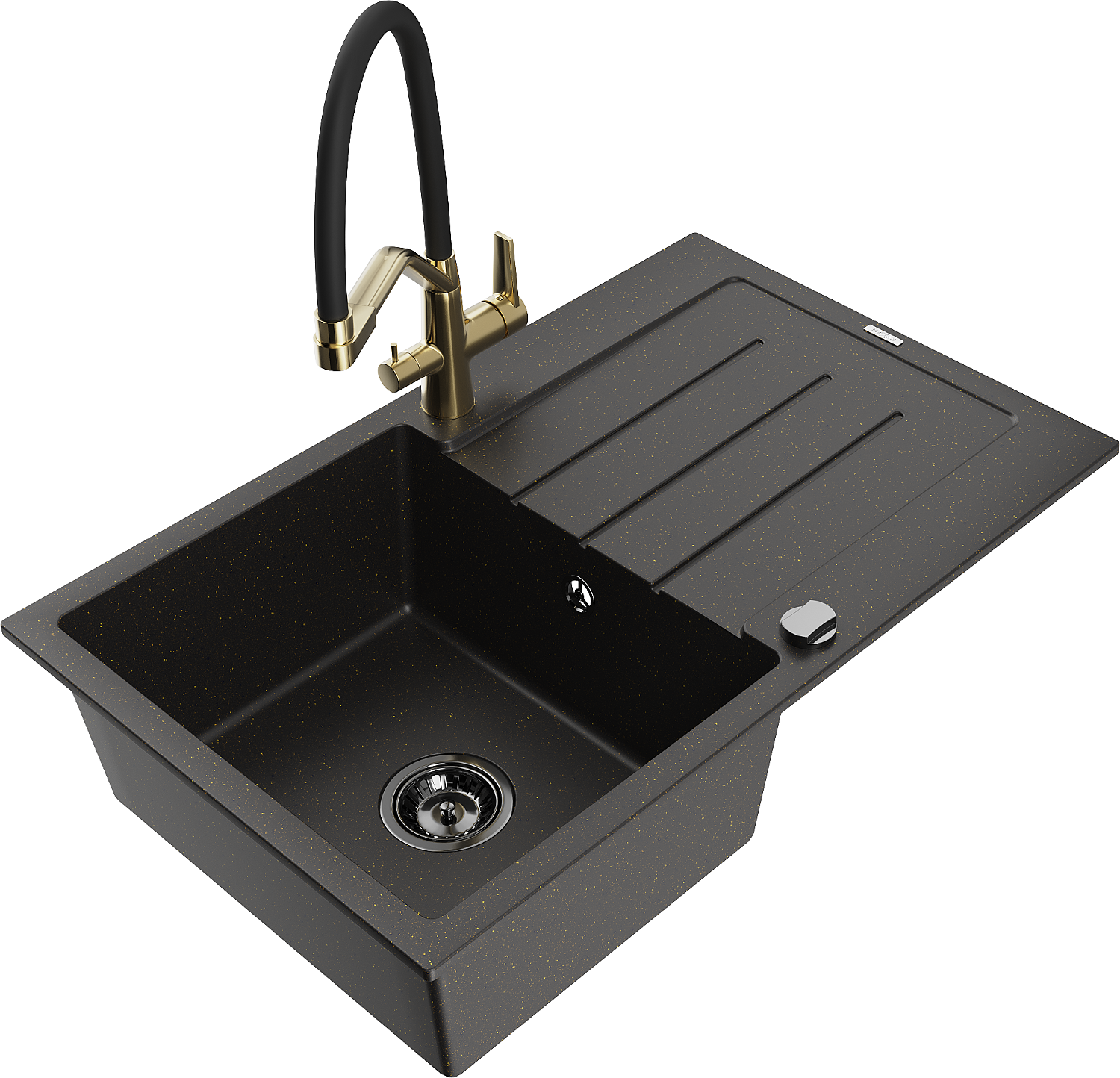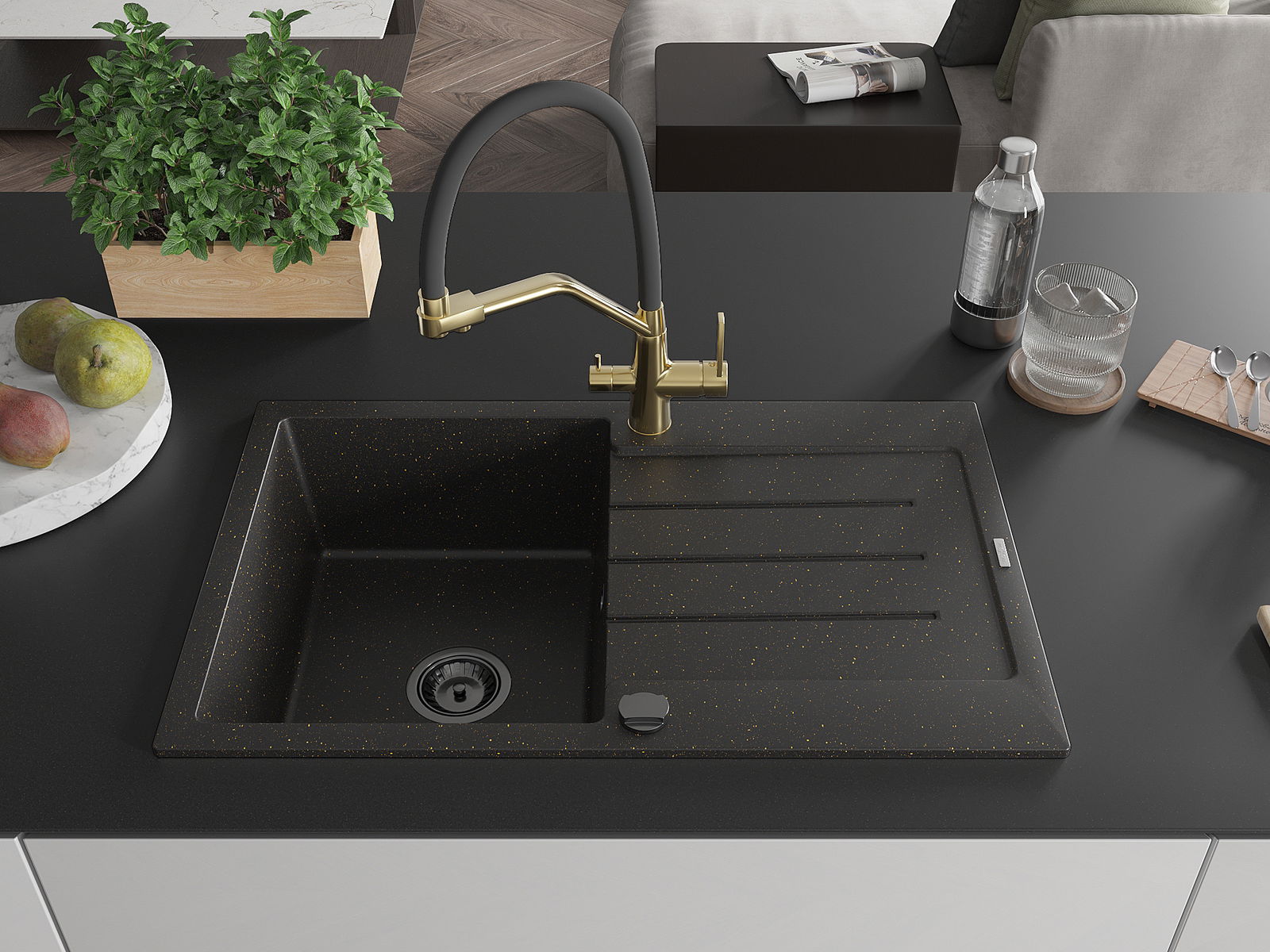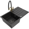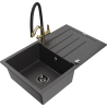 Mexen Bruno 1-bowl granite sink with drainer and Duo kitchen tap, black/gold metallic - 6513-75-671701-57-B