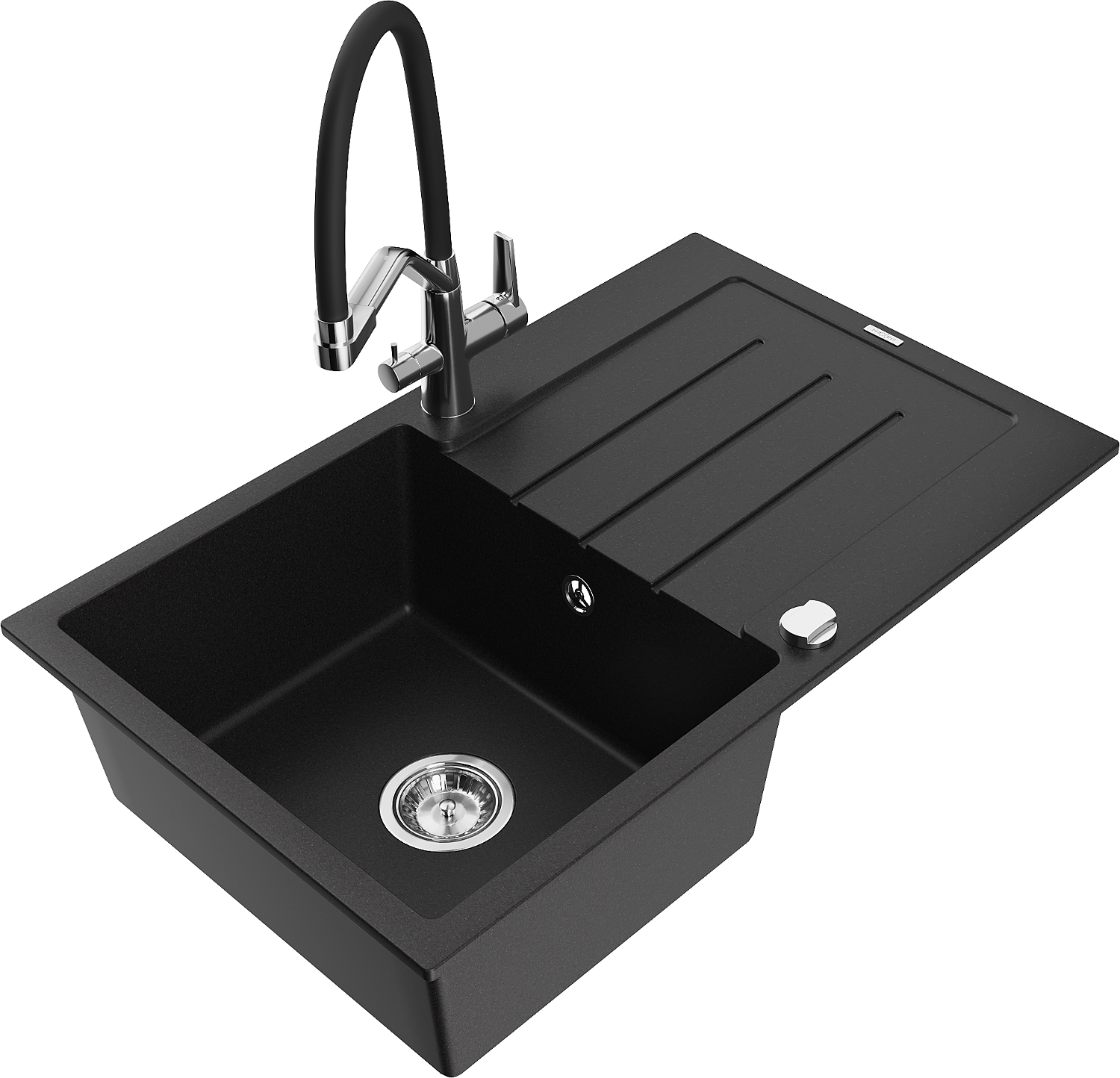 Mexen Bruno granite sink 1-bowl with drainer and Duo kitchen tap, black - 6513-77-671701-07