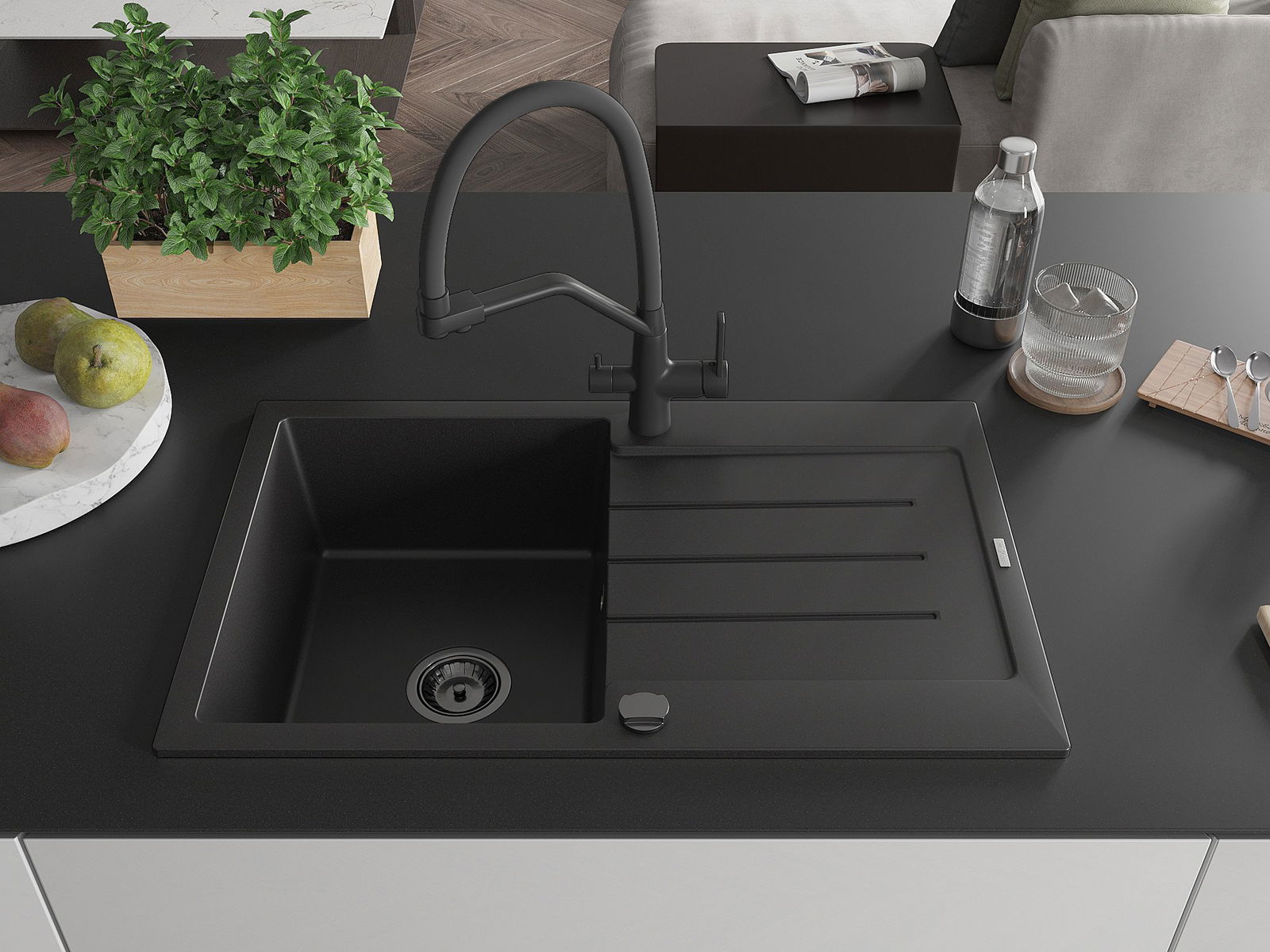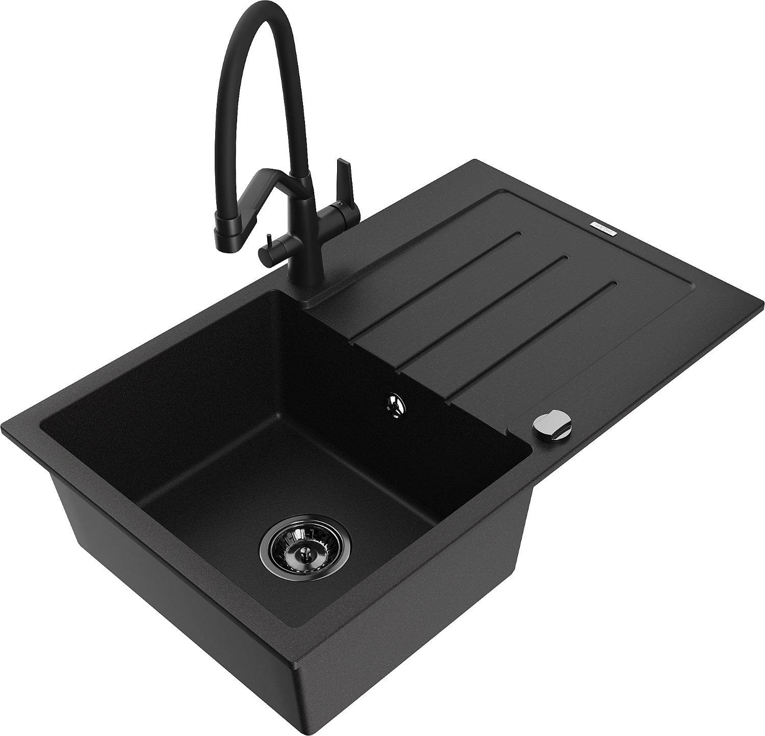 Mexen Bruno 1-bowl granite sink with drainer and Duo kitchen tap, black - 6513-77-671701-70-B