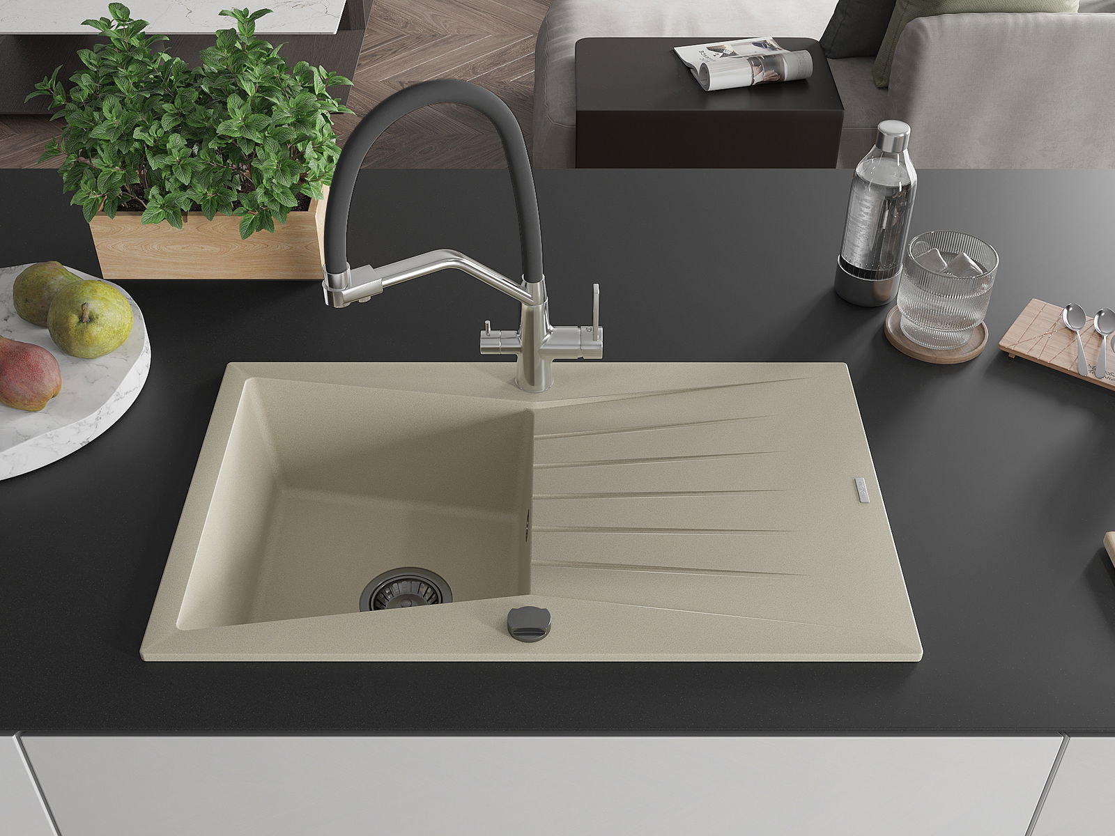 The sink is made of high quality granite. It is an elegant and, above all, practical complement to every kitchen, regardless of its style. High quality and granite durability ensure many years of use.