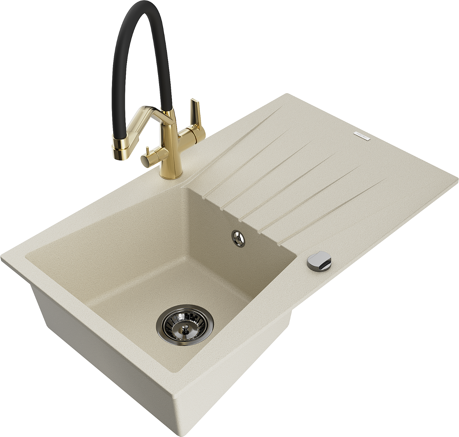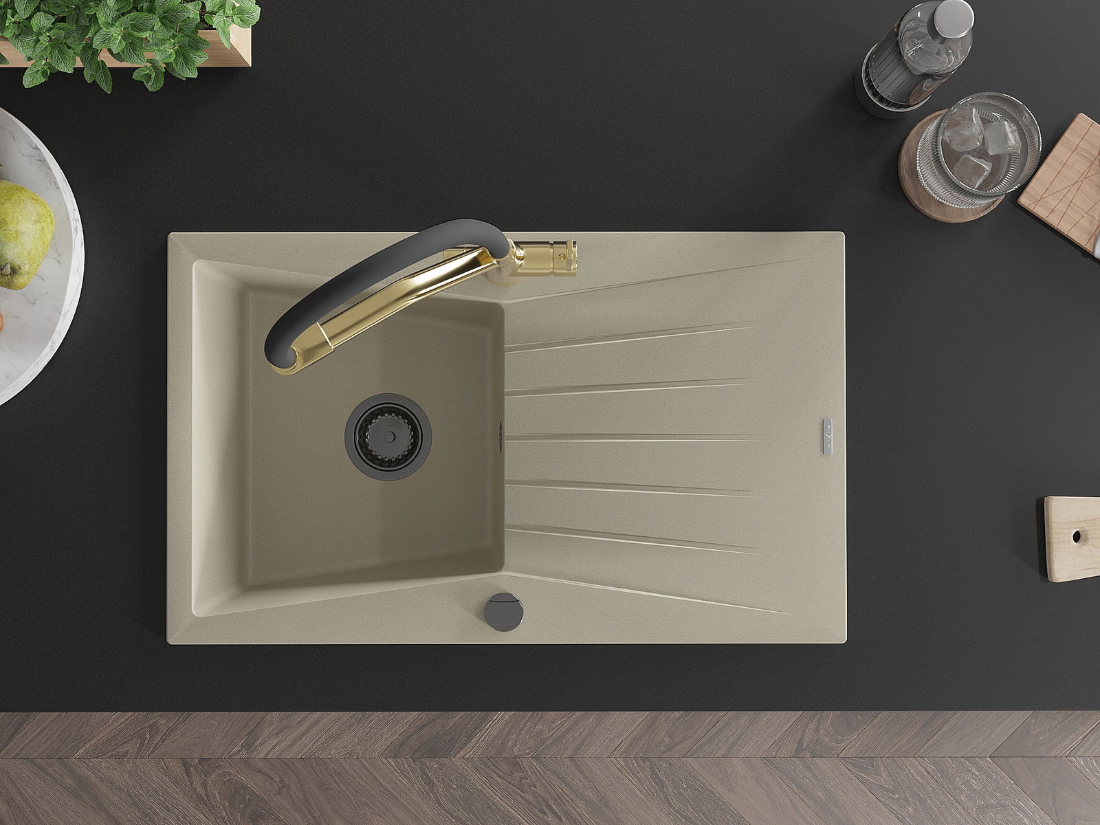 Mexen Cesar granite sink 1-bowl with drainer and Duo kitchen tap, beige - 6514-69-671701-57-B