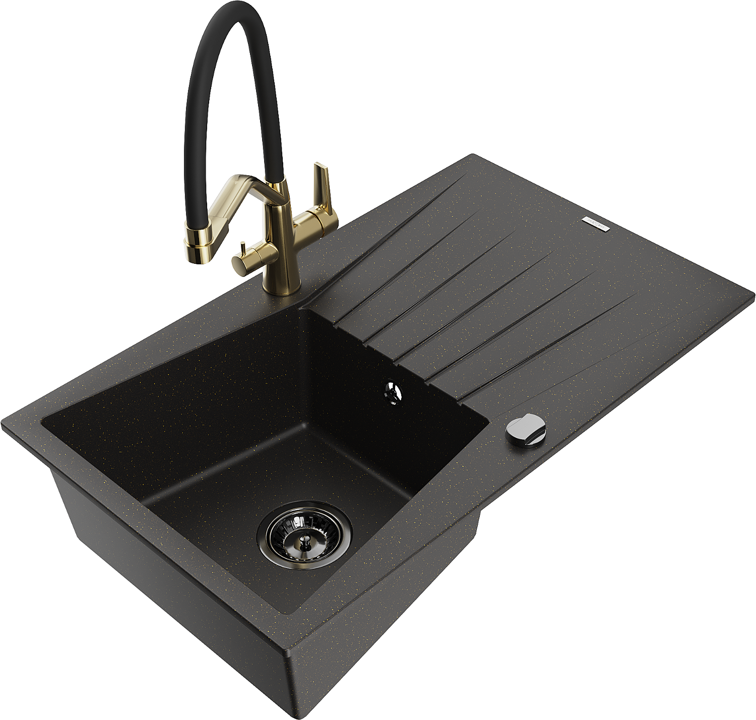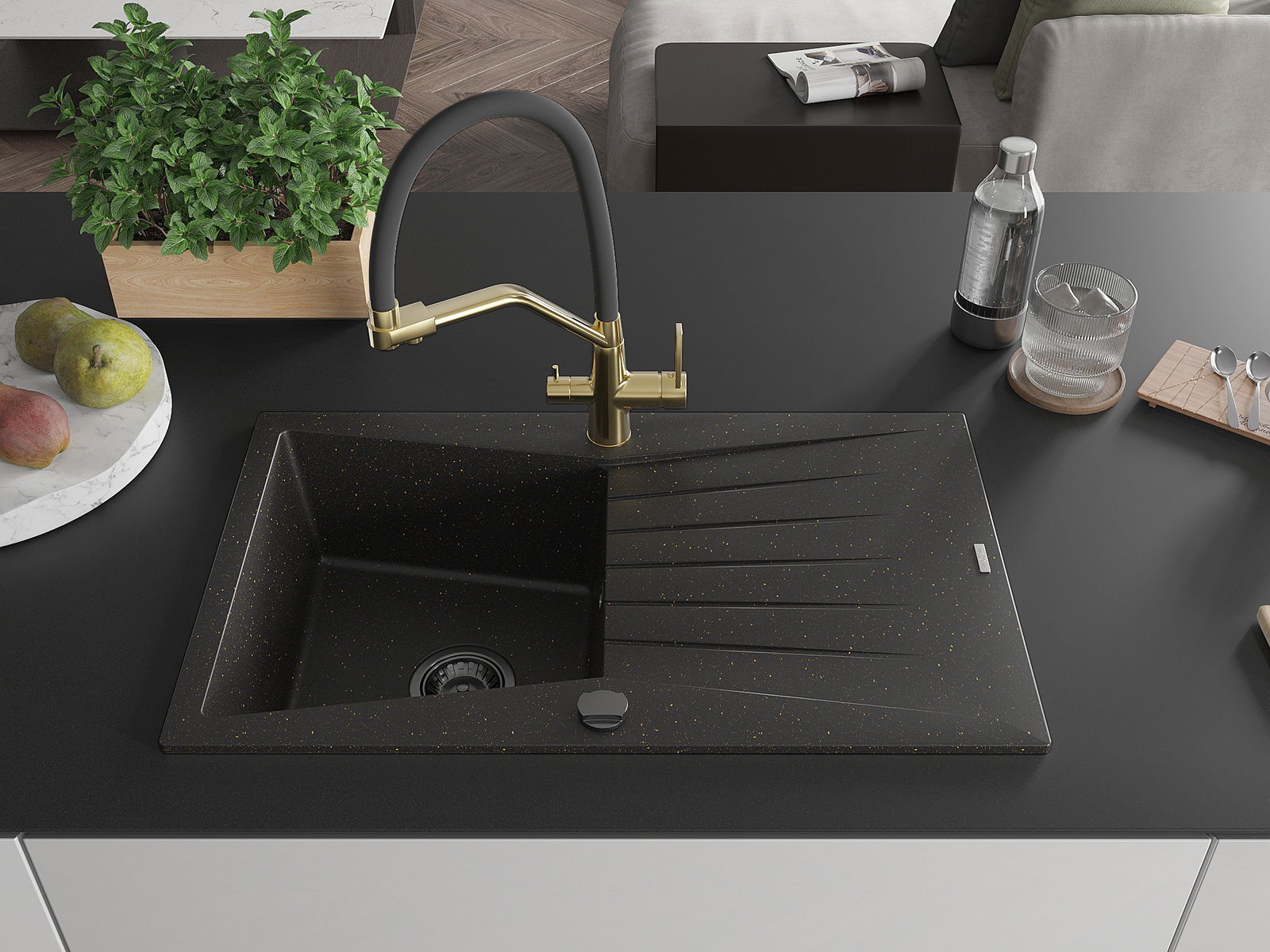 Mexen Cesar 1-bowl granite sink with drainer and Duo kitchen tap, black/gold metallic - 6514-75-671701-57-B
