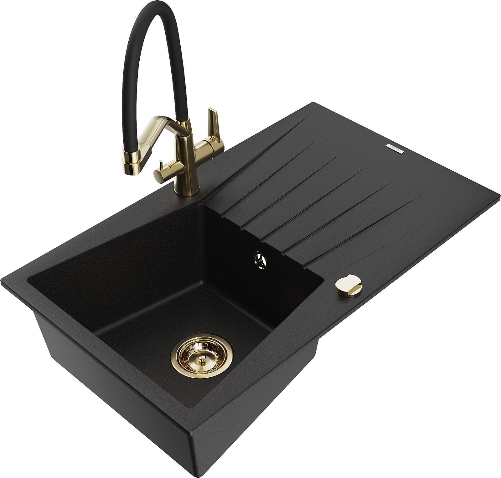 Mexen Cesar granite sink 1-bowl with drainer and Duo kitchen tap, black - 6514-77-671701-57-G