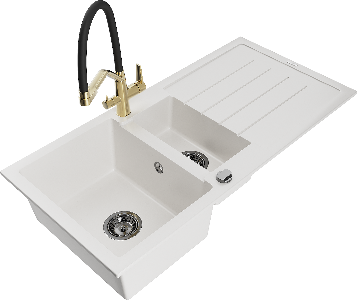 Mexen Andres granite sink 1.5-bowl with drainer and Duo kitchen tap, white - 6515-20-671701-57-B